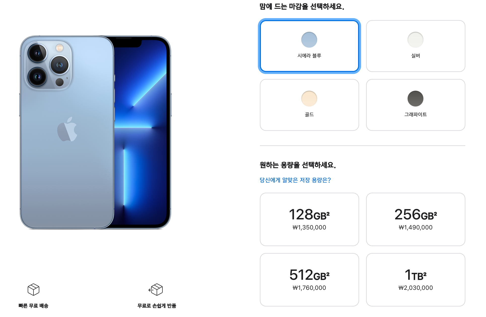 아이폰 13 프로는 확실히 아이폰13보다 가격이 비싸네요. 색상도 시에라 블루, 실버, 골드, 그래파이트 네 가지 색상으로 출시되며 아이폰 13의 색상과 하나도 겹치지 않습니다. 가격은 128GB 기준 135만 원부터 시작을 해서 256GB는 149만 원, 512GB는 176만 원, 1TB는 203만 원까지 형성되어 있습니다. 128GB 기준으로 아이폰 13과 26만 원 차이가 나니 적은 차이는 아니네요. 그렇지만 아이폰 13 프로는 아이폰 13에 비해서 카메라에 있어서 강점이 있다고 하니 사진을 찍거나 동영상을 찍는 용도로 구매하시는 분이라면 프로 모델을 구매하시는 것도 좋을 것 같습니다.