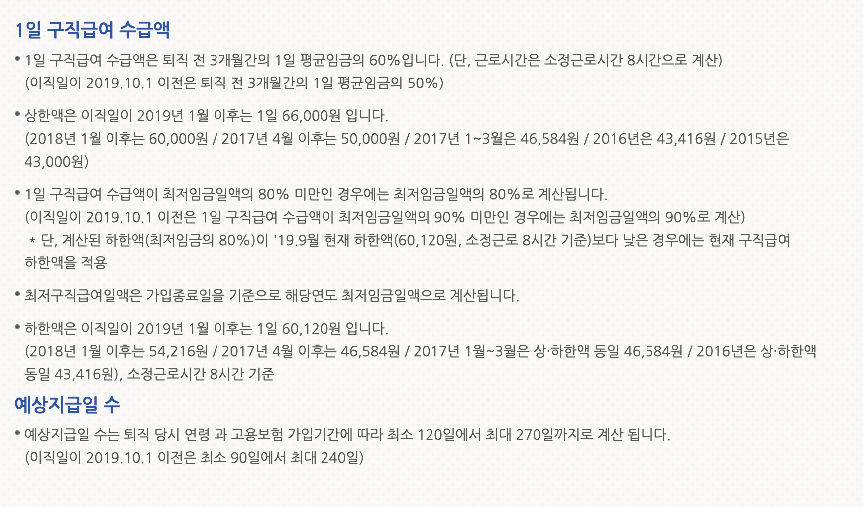 하루 8시간을 기준으로 하면 2021년 현재 최저 액은 60,120원이고 최고 액은 66,00원 정도가 됩니다. 최저액과 최고액은 일한 시간에 관계없이 적어도 60,120원 이상을 주고 많이 줘야 하루 66,000원 정도로 계산한다는 것입니다. 이 금액을 내가 받을 수 있는 지급일 수와 곱하면 실업급여 총금액이 나옵니다.