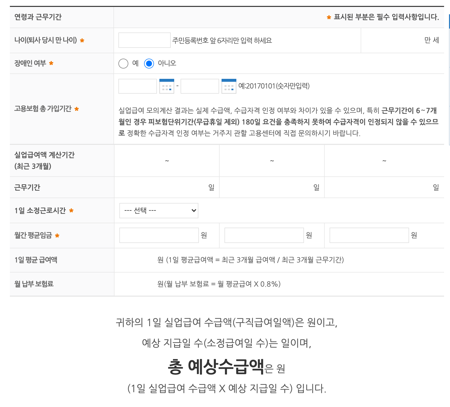 모의계산에서는 나이와 고용보험 총 가입기간, 근무시간 등을 입력하면 내가 실업급여를 통해 받을 수 있는 금액이 나옵니다. 하지만 이 금액이 최종적으로 나오는 금액은 아닙니다. 실제로 고용센터에 가서 실업급여 상담을 하고 나면 더 받을 수도 있고 덜 받을 수도 있습니다.