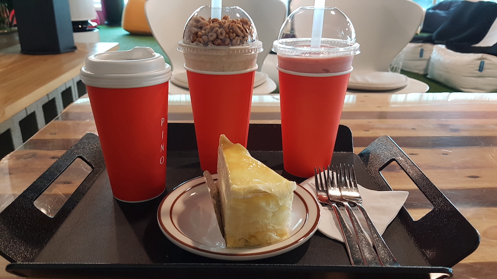 저는 같이 갔던 일행들이 있어서 여러 음료를 시켰습니다. 왼쪽부터 아메리카노, 죠리퐁라떼, 딸기 스무디입니다. 가격이 좀 나가는 만큼 음료의 양도 확실히 많아요. 그리고 케익은 크레이프 케익입니다. 약간 얇은 팬케익을 여러 겹으로 쌓은 케익인데 중간에 크림이 있어요. 알고만 있었고 처음 먹어봤는데 진짜 맛있었습니다. 피노카페에 오시면 꼭 크레이프 케익을 드셔 보세요.