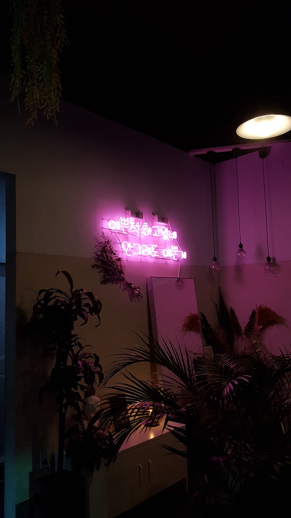 들어가자마자 제일 먼저 눈에 띄는 게 바로 이곳입니다. 저 분홍색 네온(?)이 정말 예쁘더라고요. 그 아래에 야자수 같은 식물이랑 각종 전구들로 분위기를 만들어 놓은 게 좋았습니다.
