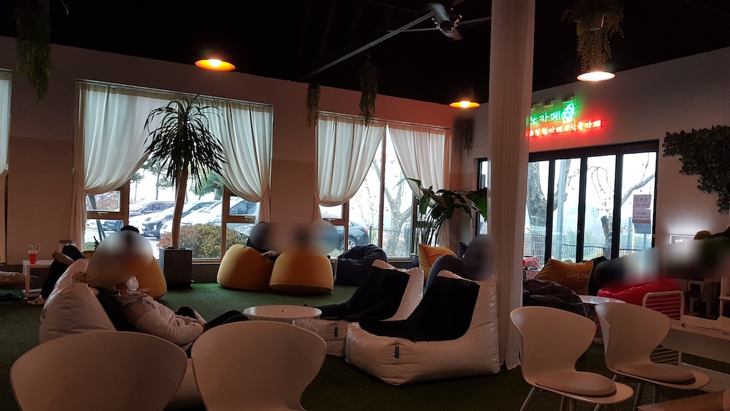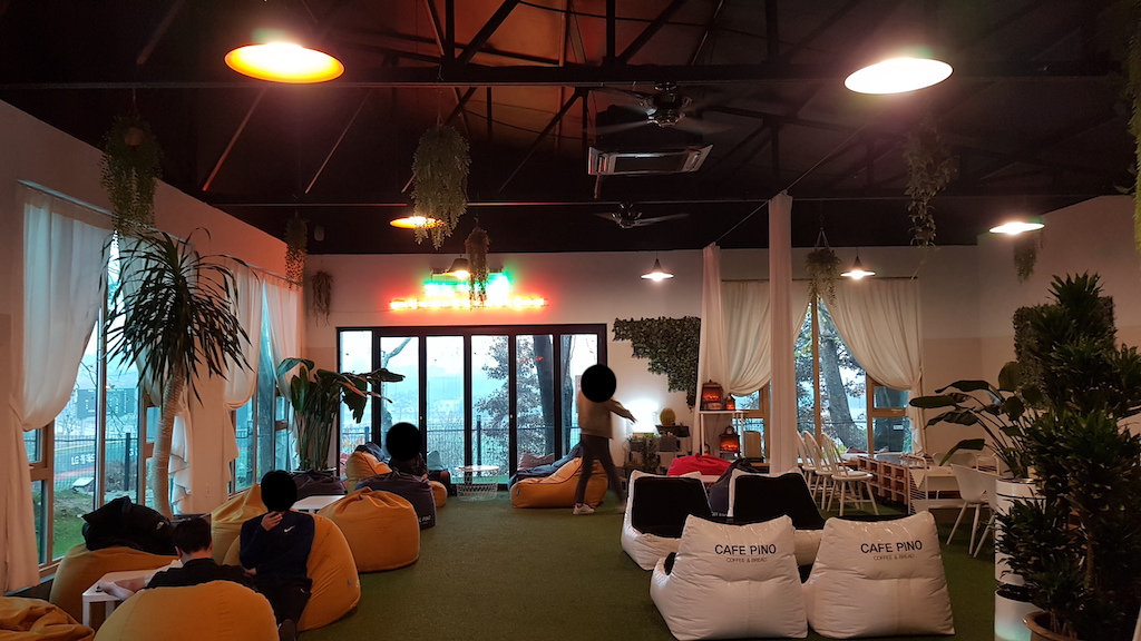 이 사진은 카페에서 나올 때 찍은 사진이라 그런지 사람이 더 없었습니다. 오후 5시쯤 되니까 사람들이 슬슬 집으로 가더라고요. 그리고 피노카페가 차가 없으면 가기 어려운 곳이라서 일찍 가야 차가 막히지 않은 것도 있습니다. 그리고 의자가 너무 편하더라고요. 보통 카페 의자는 좀 딱딱하고 등을 대기가 쉽지 않은데 이곳의 의자는 푹신하고 등도 기댈 수 있어서 좋았습니다.