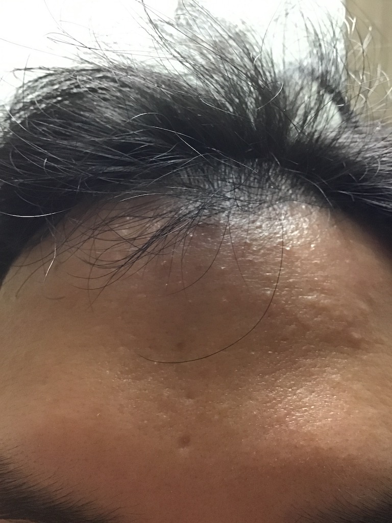 그렇다면 비오틴을 실제로 꾸준히 복용한 결과는 어떨까요. 아래 사진은 제 앞머리 부분을 찍은 것입니다. 자세히 보시면 잔머리가 조금씩 자란 것을 볼 수 있습니다. 겉으로 보기에는 효과가 없다고 느낄 수 있으나 직접 체험한 바로는 비오틴 복용 전과 후가 다른 것이 느껴집니다. 물론 비오틴뿐 아니라 탈모약과 미녹시딜과 같이 약물치료를 병행했기 때문일 수도 있지만 그래도 비오틴이 모발 건강에 큰 도움이 되는 것 같습니다.