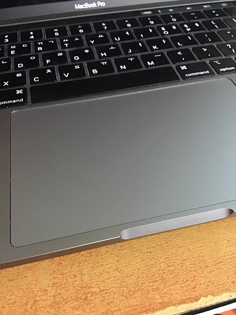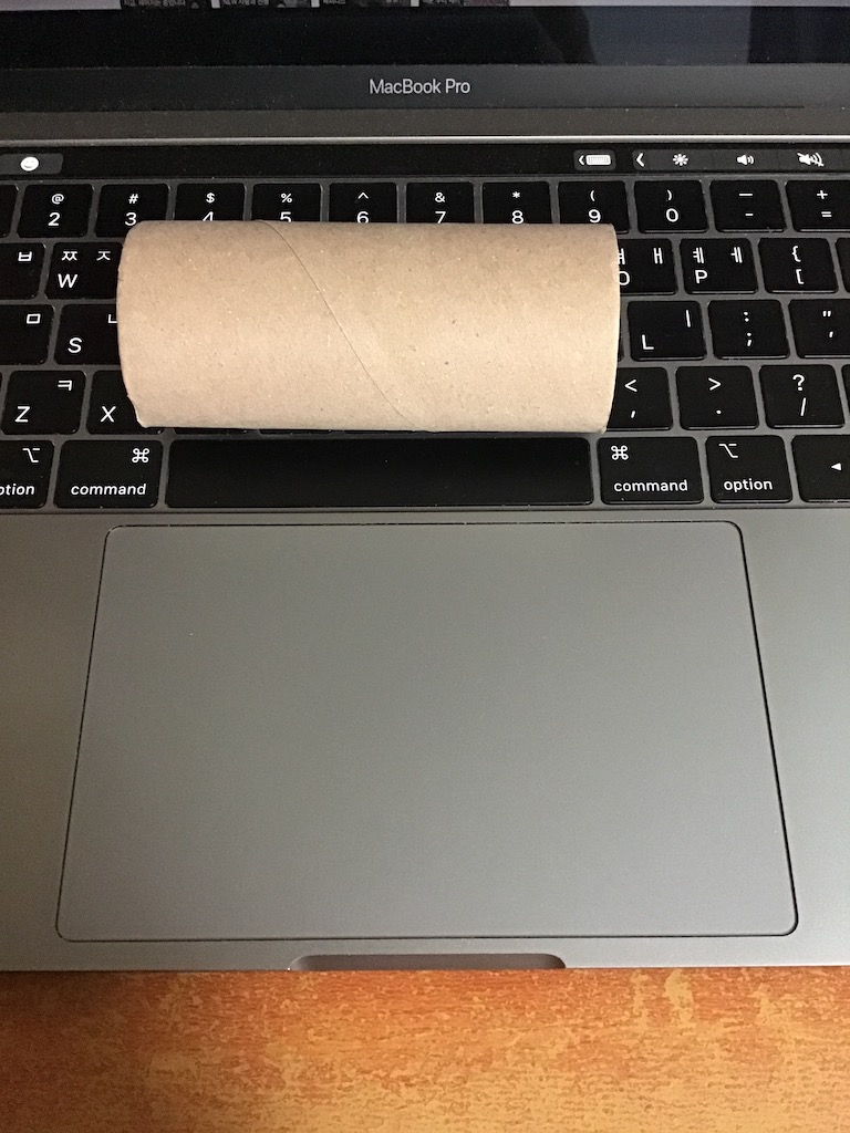 일단 맥북 트랙패드를 살펴보면 꽤 작지 않은 사이즈를 가지고 있습니다. 제 노트북이 맥북프로 13인치모델인데요. 맥북프로 모델 중에서는 가장 작은 모델이고 다른 브랜드의 노트북과 비교해봐도 크지 않은 사이즈입니다. 하지만 가운데에 있는 트랙패드는 생각보다 크게 있습니다. 보통 13인치 노트북의 경우 스페이스바 사이즈 정도의 마우스 패드가 있는데요. 이에 비해서 맥북은 훨씬 넓은 사이즈의 트랙패드를 장착하고 있습니다. 아래 사진에 보이는 휴지심과 비교해봐고 손가락 2개 정도 더 큰 사이즈라고 볼 수 있습니다.