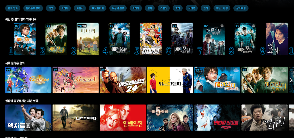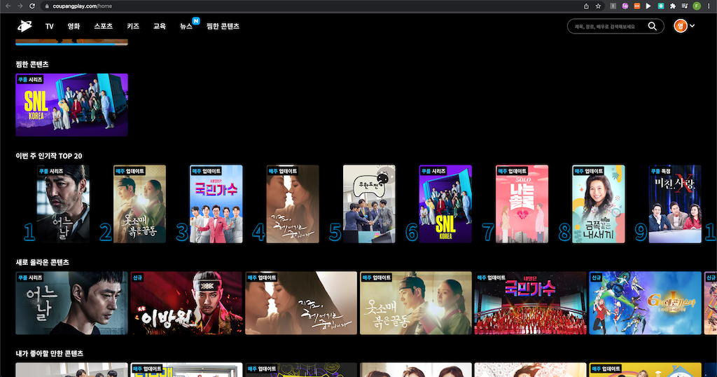 특히 국내에서 방영되고 있는 TV드라마나 예능이 많이 있었고 국내 영화도 많이 있었죠. 예전에 봤던 한국영화들이 쿠팡 플레이에서도 많이 있었습니다. 왓챠는 안 써봐서 잘 모르겠지만 적어도 한국영화는 넷플릭스보다는 많이 있었던 것 같습니다. 한국영화를 좋아하고 주로 보시는 분들이라면 쿠팡 플레이에 가입해서 사용하는 것도 좋을 듯합니다.