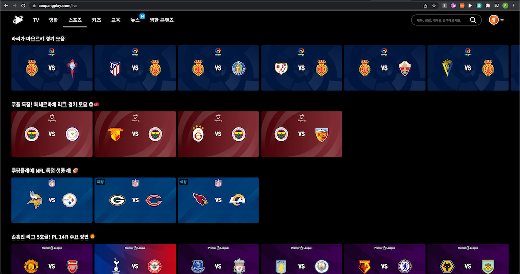 최근 쿠팡플레이가 크게 주목을 받은 이유가 있다면 스포츠 중계를 한다는 것입니다. 쿠팡 플레이를 통해서 프리미어리그와 프랑스 리그앙 경기를 볼 수 있습니다. 이 외에도 NFL 같은 경기도 볼 수 있죠. 하지만 모든 경기를 중계하는 것 같지는 않습니다. 예를 들어 손흥민의 토트넘 경기는 중계를 하는데 황희찬의 울버햄튼 경기는 중계를 안 하더라고요. 이강인의 프리메라리가 마요르카 경기과 김민재의 터키리그 페네르바체 경기도 중계를 합니다. 물론 SPOTV에서 볼 경우 따로 요금을 지불하고 봐야 하는데 그래도 쿠팡 플레이에서는 저렴하게 해외 리그들을 볼 수 있습니다. 축구를 보려고 쿠팡 플레이를 보는 사람들도 많이 있습니다. 국가대표 경기도 중계를 해준다는 점에서 괜찮더라고요.