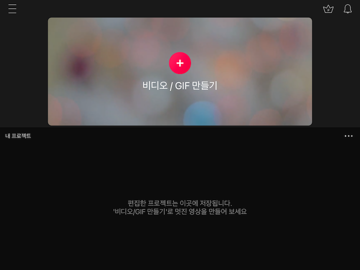 아이패드에서 VLLO를 설치했습니다. 바탕화면에 빨간 아이콘이 생기는데 물고기 모양이 그려져있습니다. VLLO를 설치하고 시작하면 이렇게 화면이 나옵니다. 현재 저는 편집한 영상이 없어서 아무것도 뜨지 않지만 위에 비디오/GIF 만들기를 통해서 영상 편집을 시작할 수 있습니다.