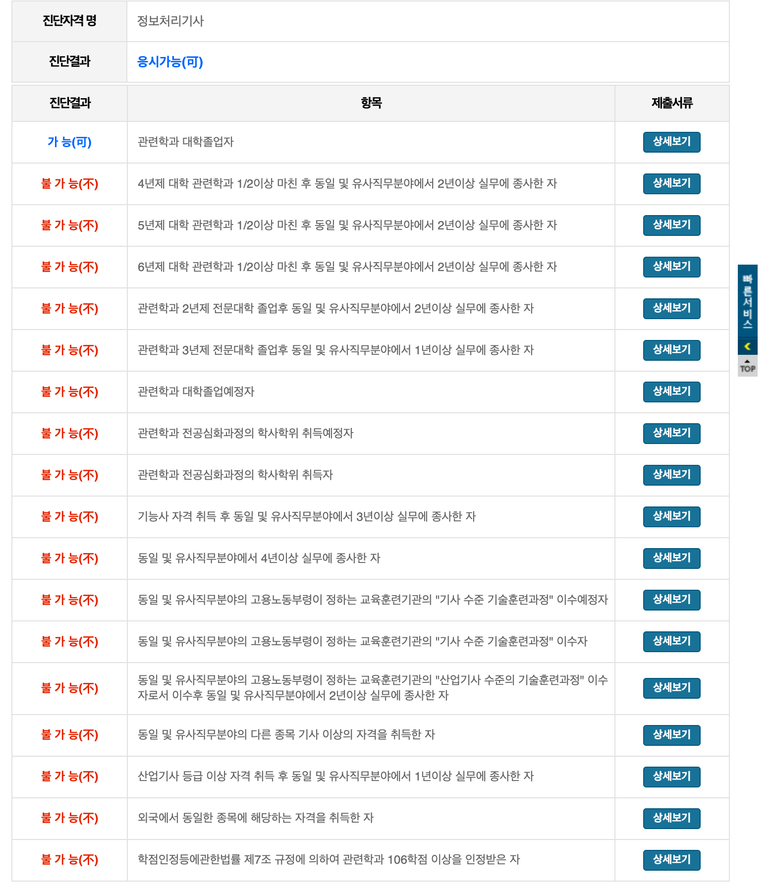 정확히 내가 시험을 볼 수 있는지 없는지를 판단하기 어려울 때에는 큐넷 공식 홈페이지를 통해서 정확히 진단을 받을 수 있습니다. IT 분야 취업에 있어서 정보처리기사는 매우 중요한 자격증인만큼 기회가 될 때 꼭 따셔서 취업에 도움이 되었으면 좋겠습니다.
