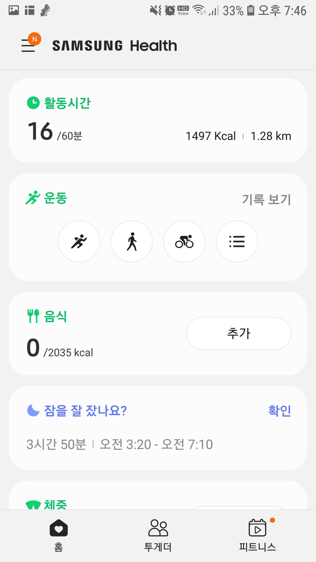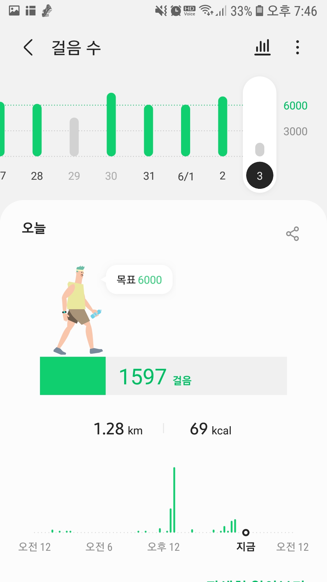 하루 동안 자신이 얼마나 걸었는지 보여준다. 물론 숫자 카운트가 핸드폰의 진동으로 인식을 하기 때문에 직접적인 걸음수나 운동거리와는 다를 수 있지만 삼성 헬스 걸음수 체크로 어느 정도는 내가 움직였는지 가늠할 수 있다.
