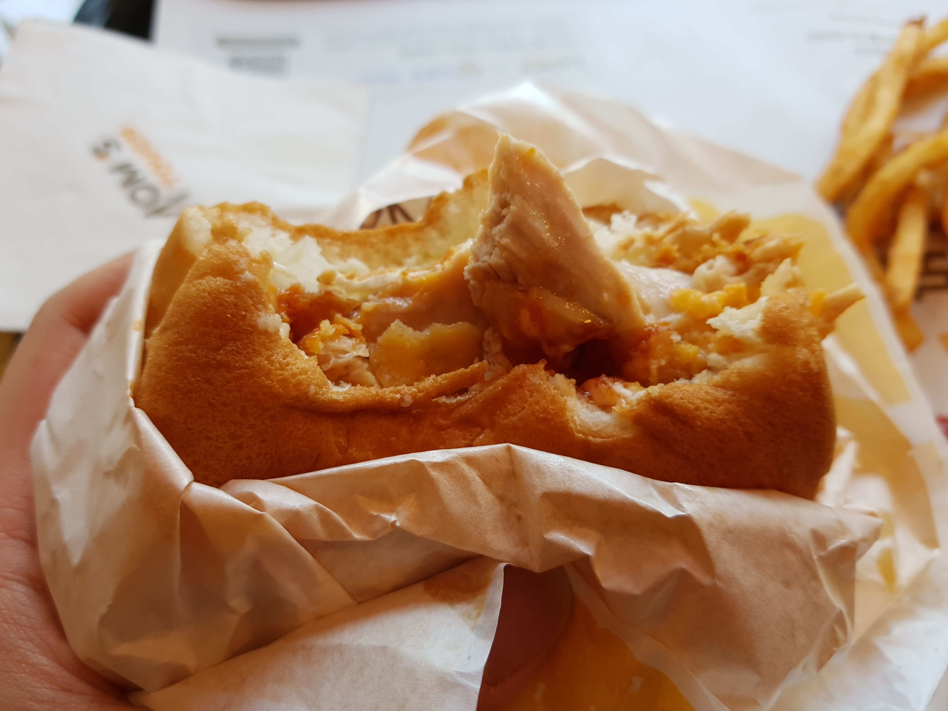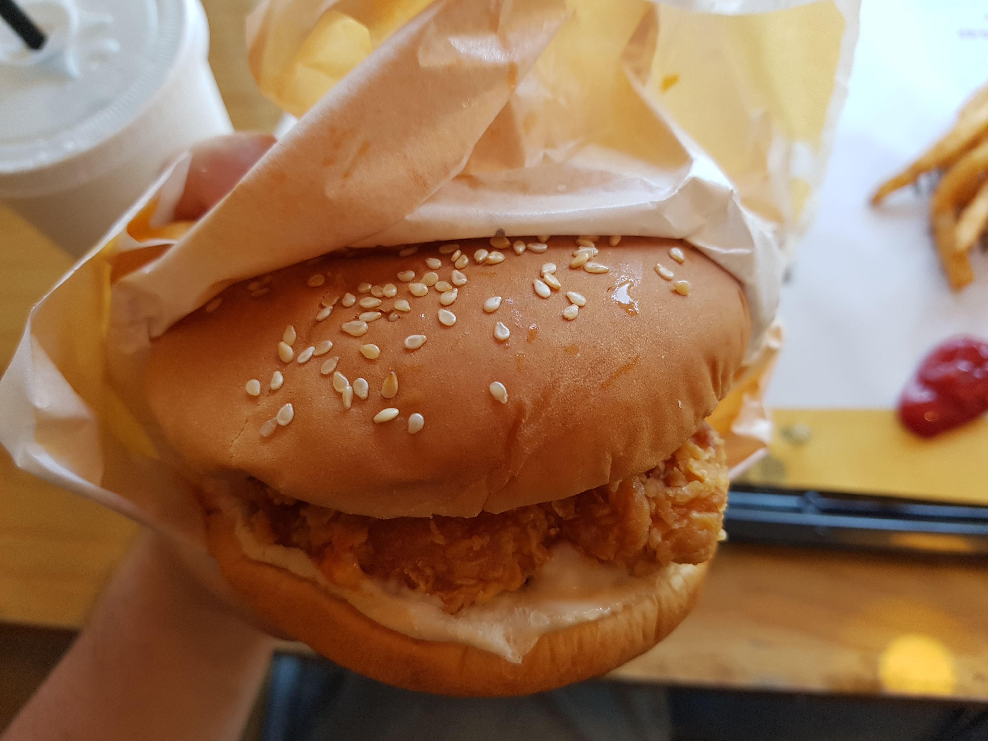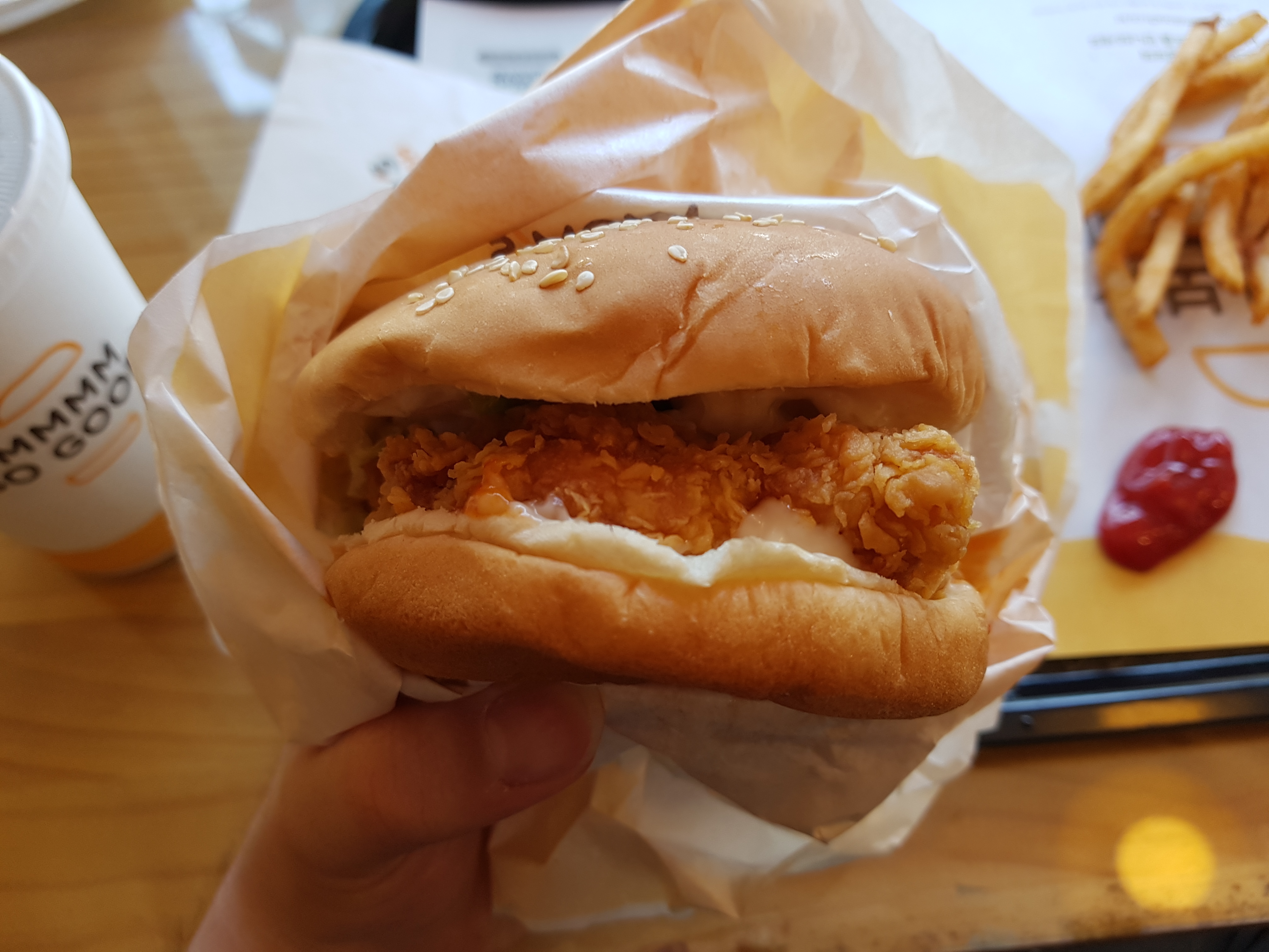 지점마다의 차이 때문인지 여기 양념치킨싸이버거는 양념이 그렇게 많지는 않았다. 사실 예전에 여기서 비슷한 메뉴인 간장치킨싸이버거를 먹었는데 그때는 소스가 아주 많이 있어서 꽤 맛이 풍부했었다. 이번에는 아마 만든 사람이 달라서 소스의 양도 달라졌을 거라고 스스로 추측해본다.