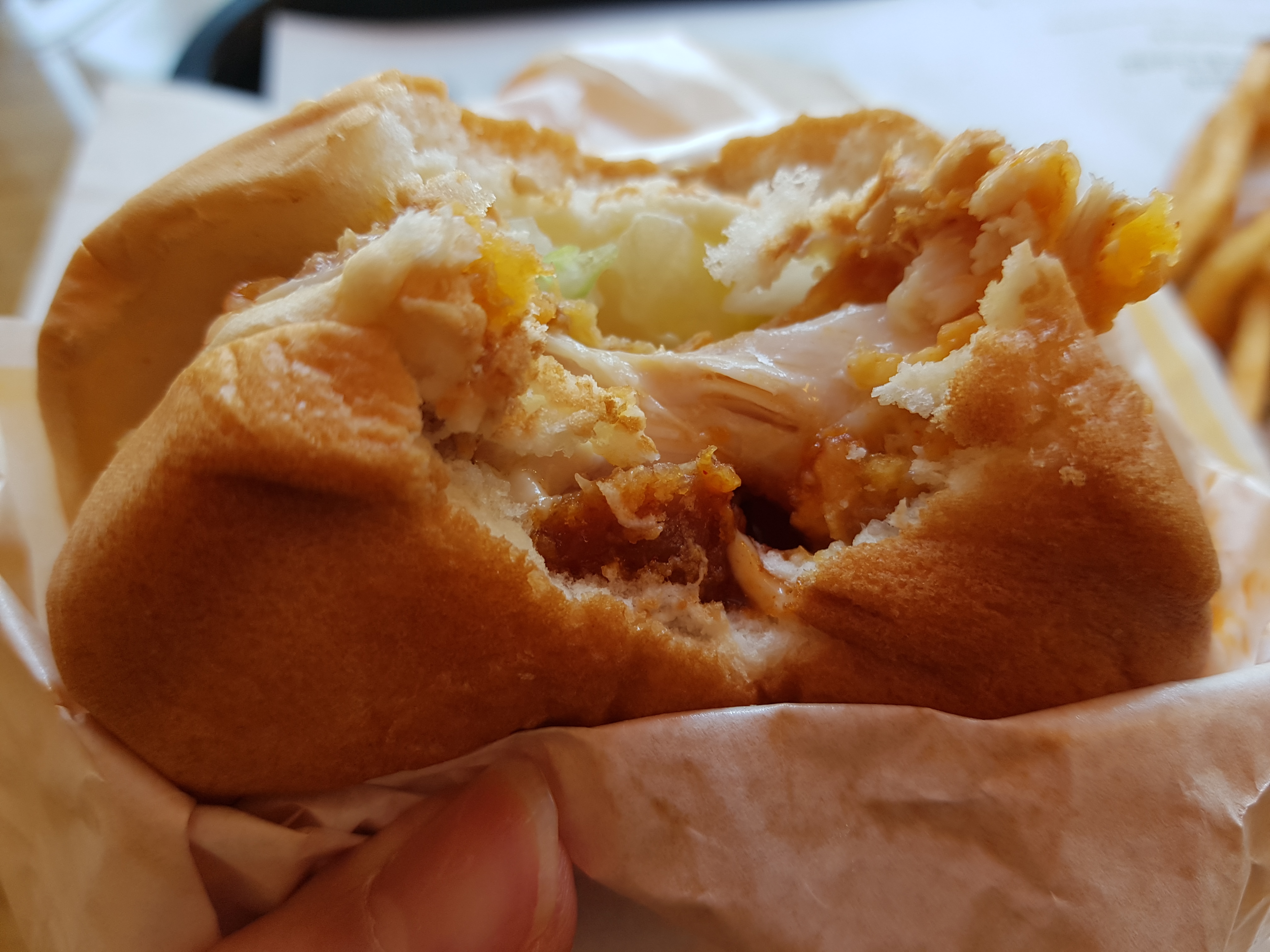 그래서 크게 한입 베어 물었더니 드디어 안쪽에 양념의 모습이 보였다. 그럼 그렇지 이게 양념치킨싸이버거가 그냥 싸이버거와 같다면 말이 안 된다.