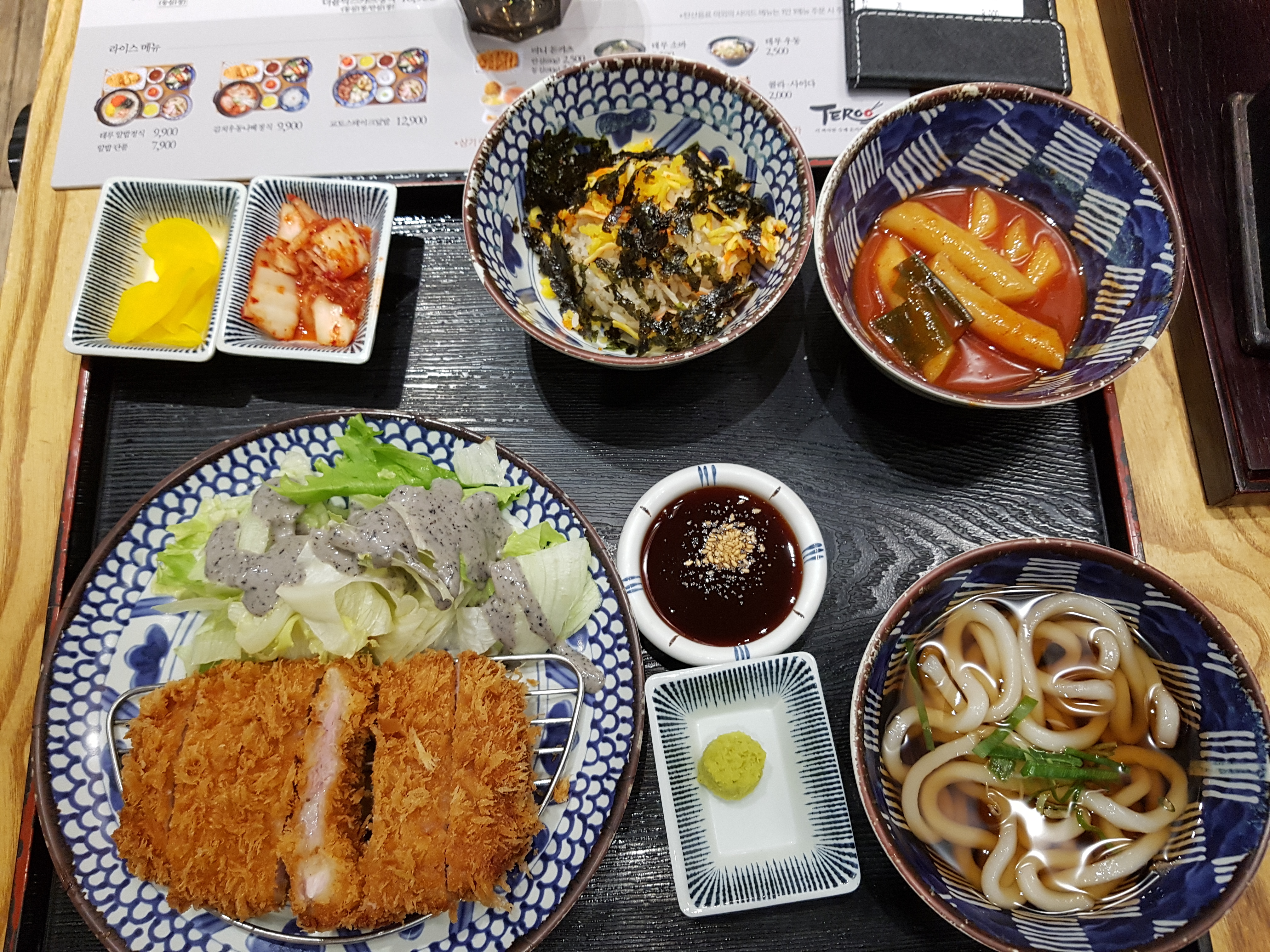 테루 돈까스에는 단품 메뉴와 정식 메뉴가 있는데 정식은 가락국수와 주먹밥 그리고 떡볶이를 같이 제공한다. 특히 떡볶이는 무한리필이 가능한 메뉴여서 돈까스만 먹고는 배가 좀 허전한 사람에게는 떡볶이 무한리필이 괜찮은 선택인 것 같다. 그래도 돈까스 집은 돈가스가 중요하다는 생각에 일단 기본 테루 돈카츠 정식을 주문했다.