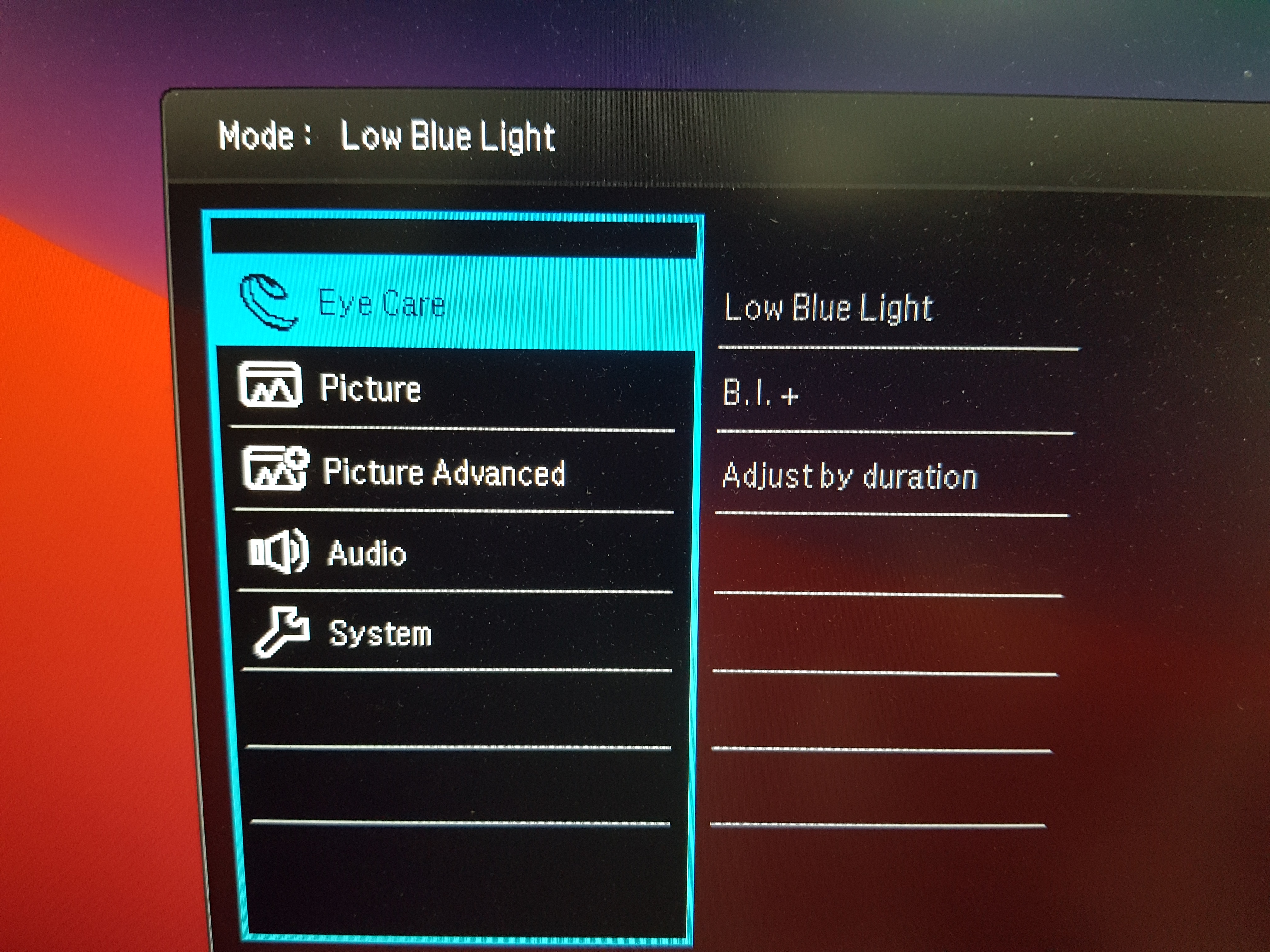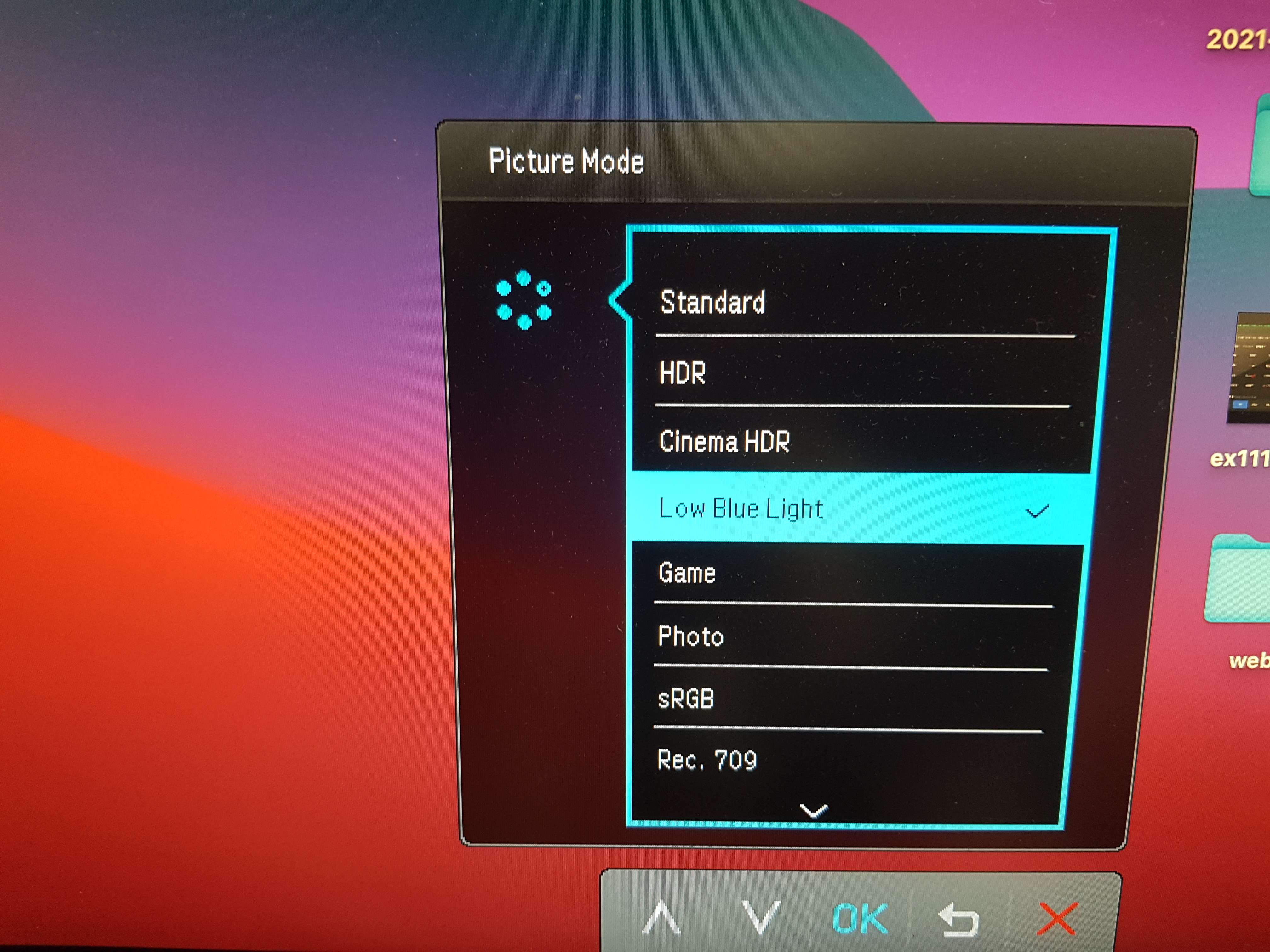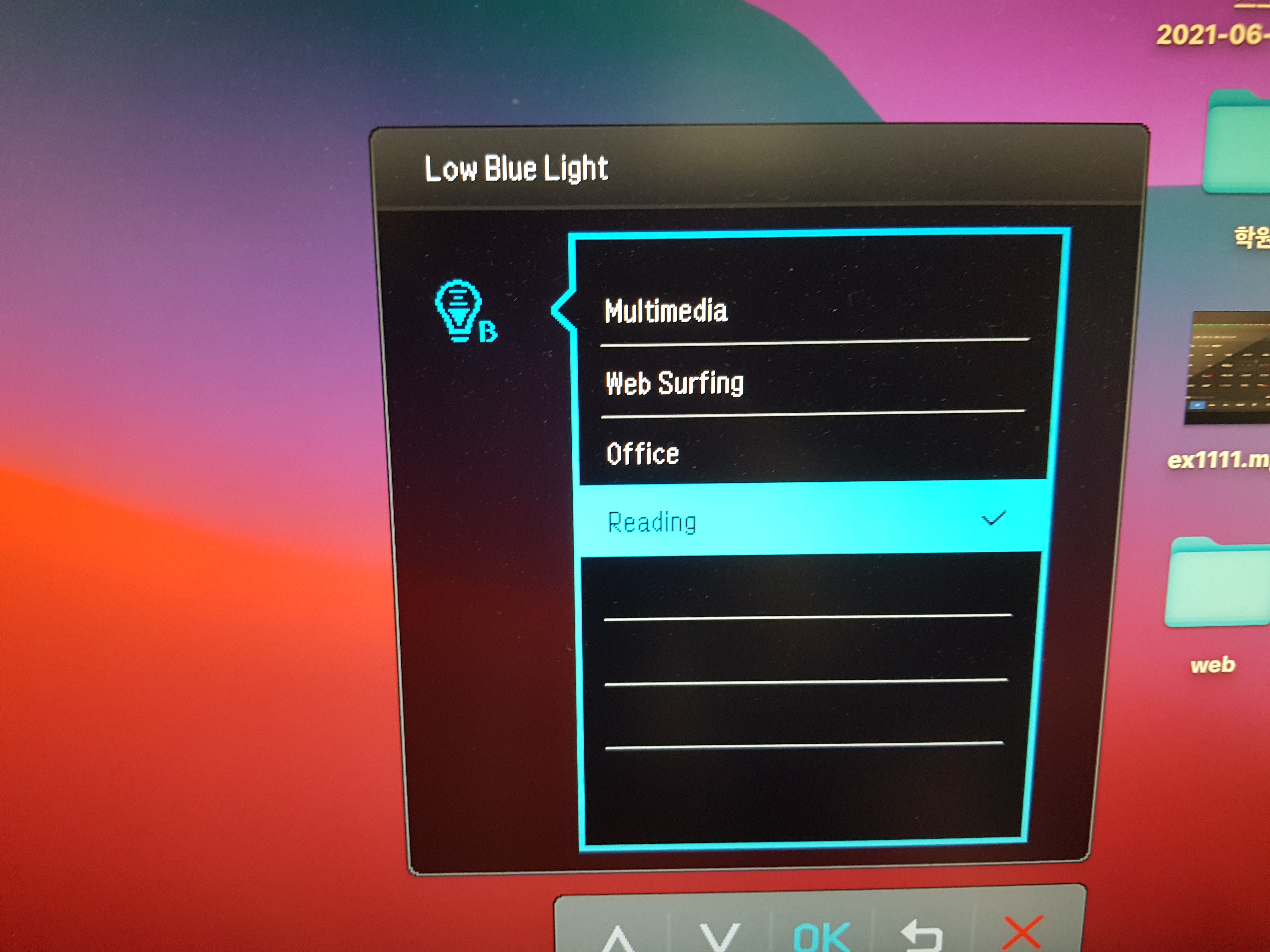 평소 사용할 때에는 낮은 불빛이 들어오는 Low Blue Light로 설정을 한다. 아무래도 화질이 너무 밝으면 눈에 자극이 많이 돼서 쉽게 피로해지기 때문이다. 벤큐 모니터 EL2870U는 이렇게 자신의 작업 스타일이나 눈의 피로도에 맞게끔 설정할 수 있다.
