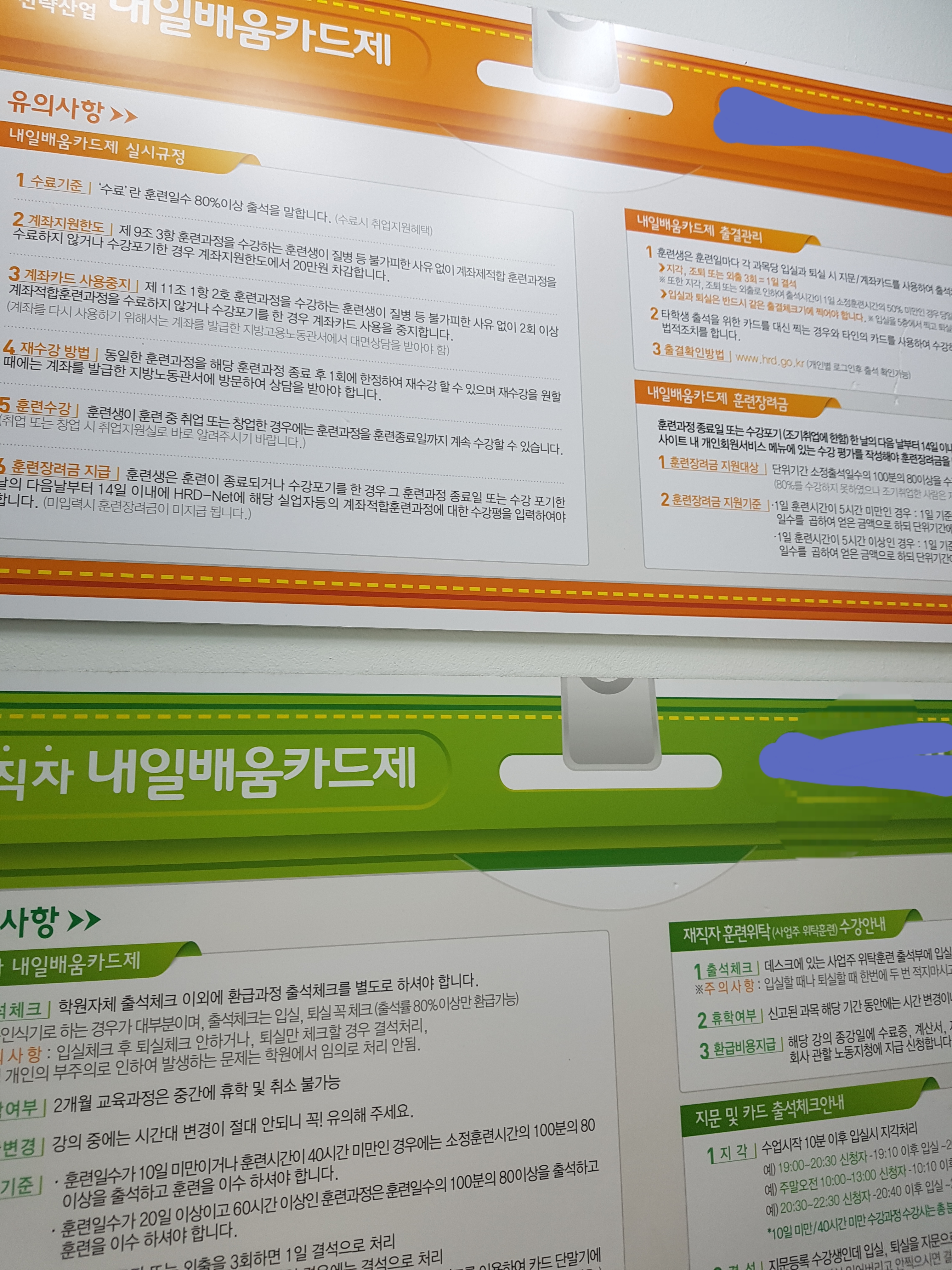 대면 강의시 출석 확인하는 법이다. 옆에 바코드에 내일 배움 카드를 찍으면 바로 출석 체크가 가능하다. 이건 수당과도 연결이 돼서 무조건 찍어야 하고 입실과 퇴실 과정에서 찍는 것이 중요하다. 외출, 지각이 3번이면 1회 결석으로 된다.