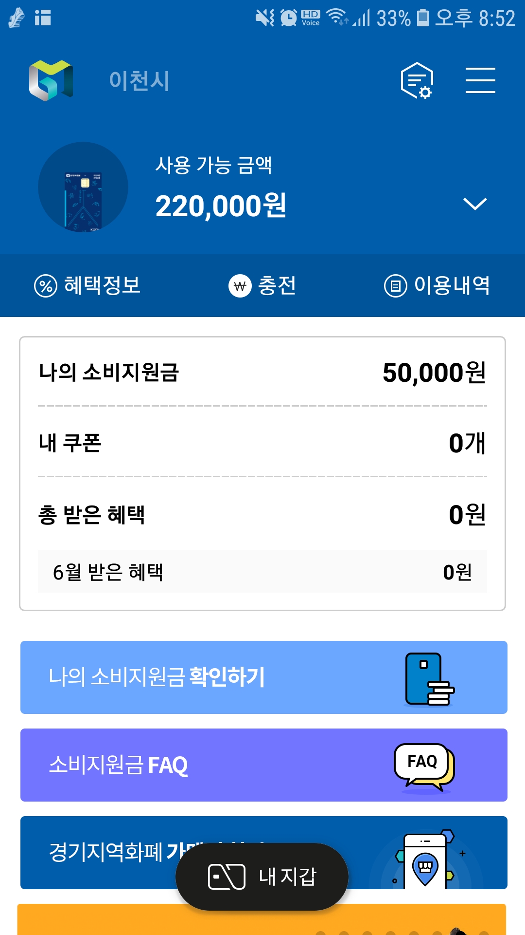 재난지원금을 받았을 때에 발급받은 경기지역화폐다. 사실 그 이후로 안쓸 줄 알았는데 이렇게 또 사용하는 날이 왔다. 그래도 재난지원금 나왔을 때는 편의점도 가고 치킨도 먹고 참 유용하게 사용했다.
