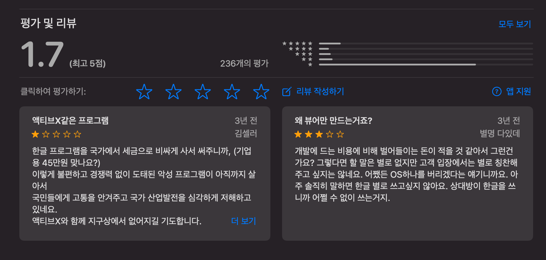 하지만 내 생각과는 다르게 평판은 별로 좋지는 않다. 별점 1점으로 평가를 내린 사람이 대부분이다. 나는 잘됐지만 사람들은 잘 안되는 부분이 많이 있나보다. 현재는 정품을 구매해서 무리없이 한글 편집을 하고는 있지만 그래도 사람마다 차이가 많이 있나보다.