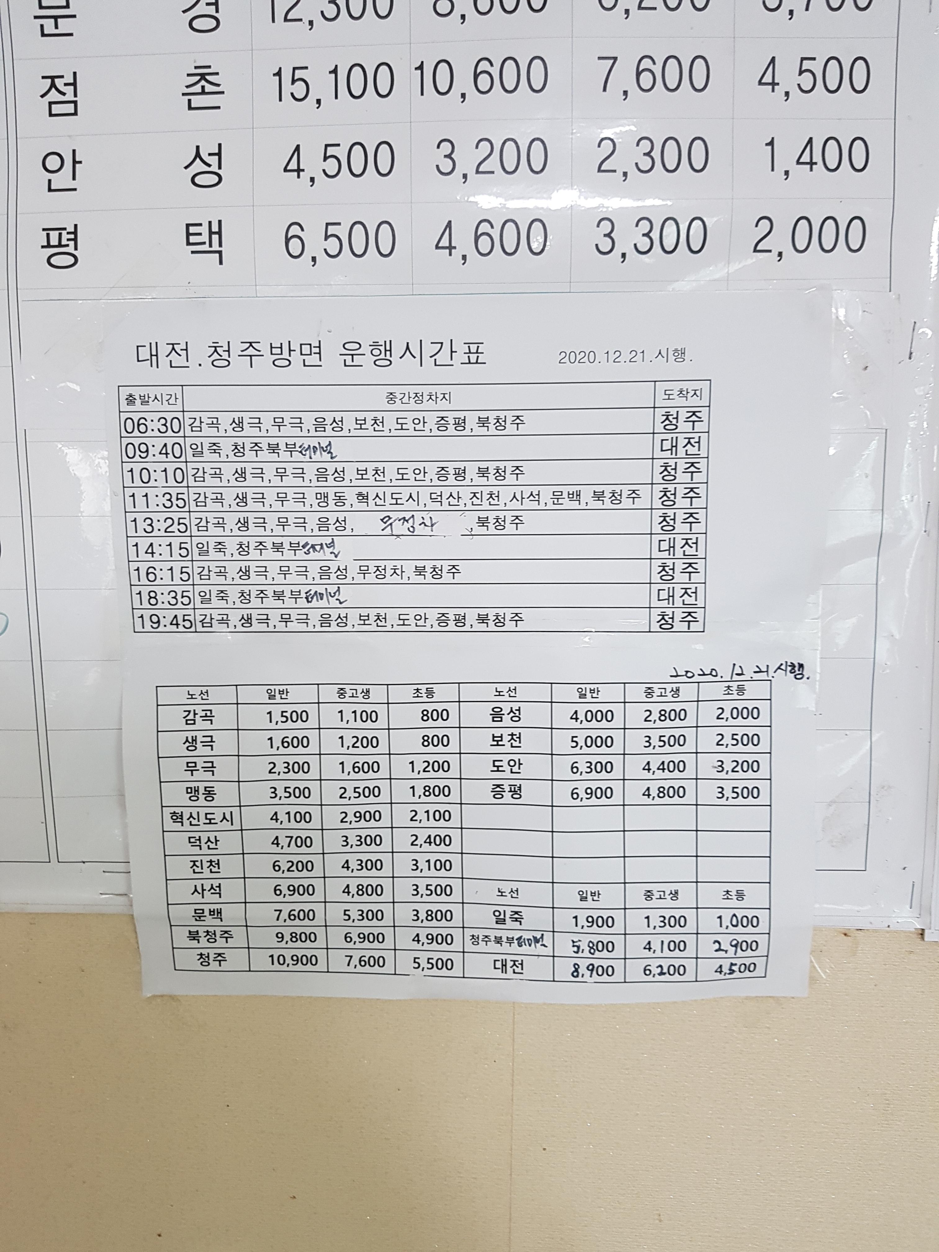 시골 터미널의 특징은 시간표가 정말 유동적이라는 것이다. 시간표가 바뀌는 방식도 이렇게 시골스럽다. 그냥 종이로 찍 붙여서 매직으로 쓰면 그만이다. 그리고 그렇게 적은 시간표마저도 정말 자주 바뀐다. 예전에는 탔던 버스가 어느 순간에는 없어진다.