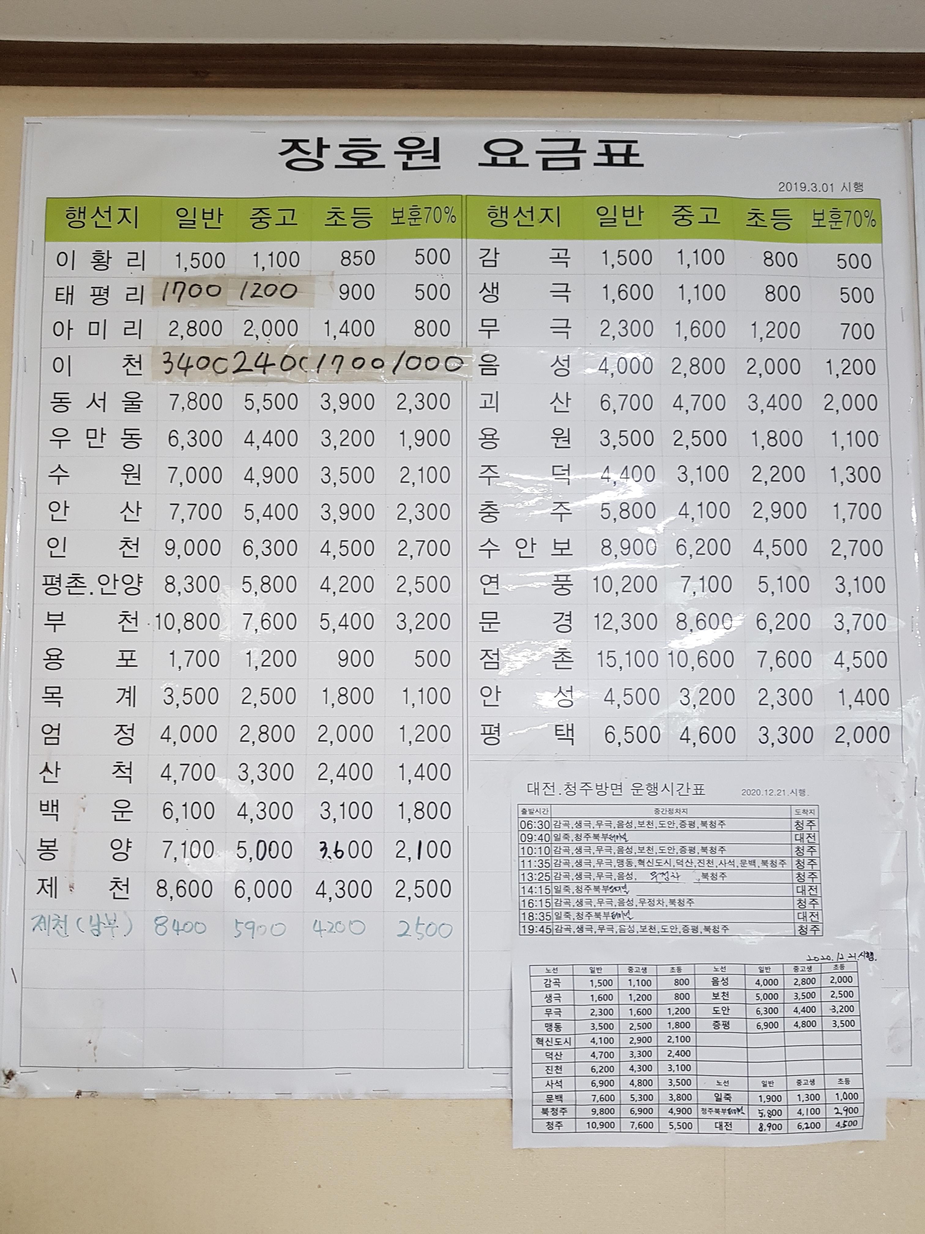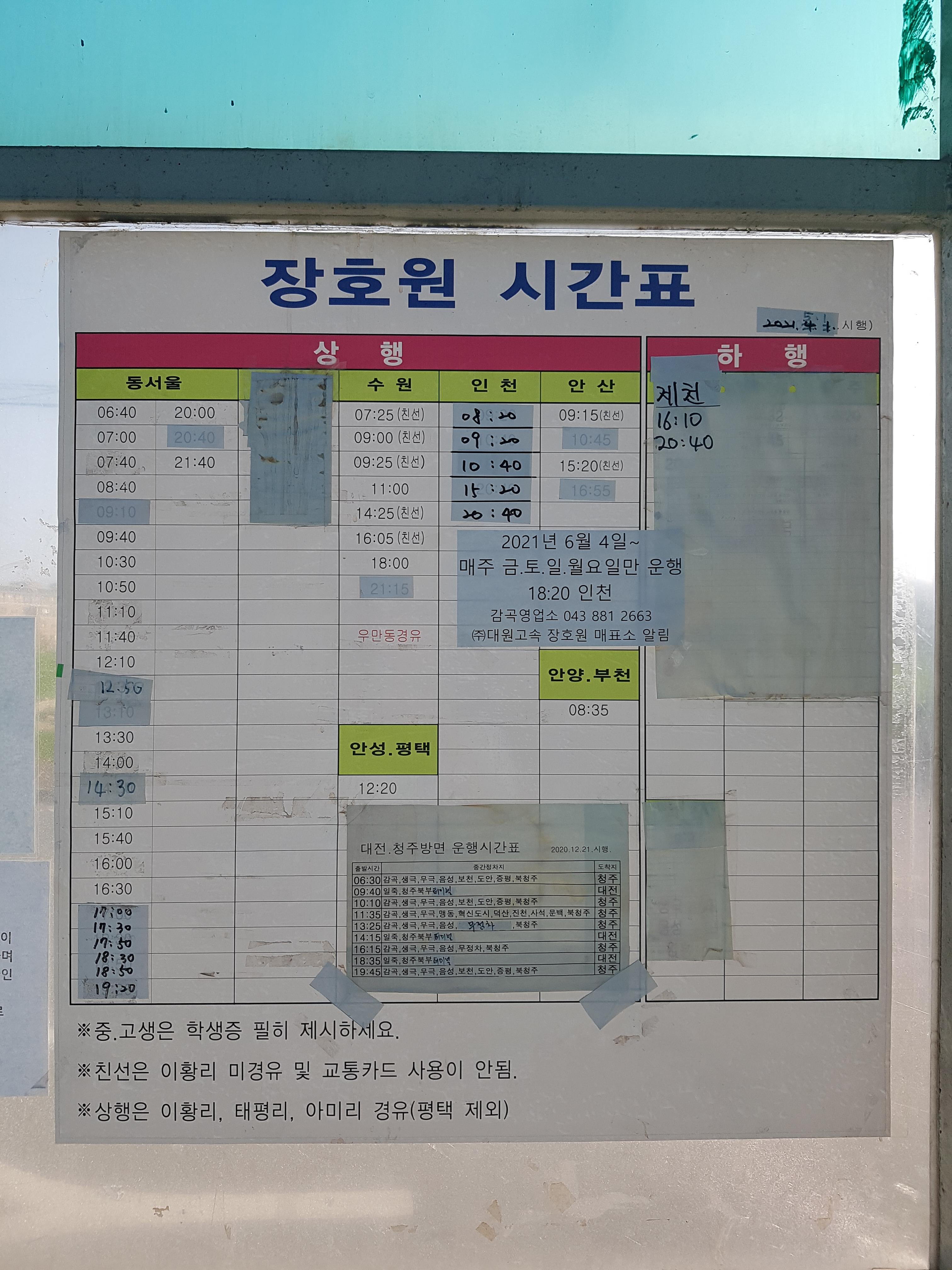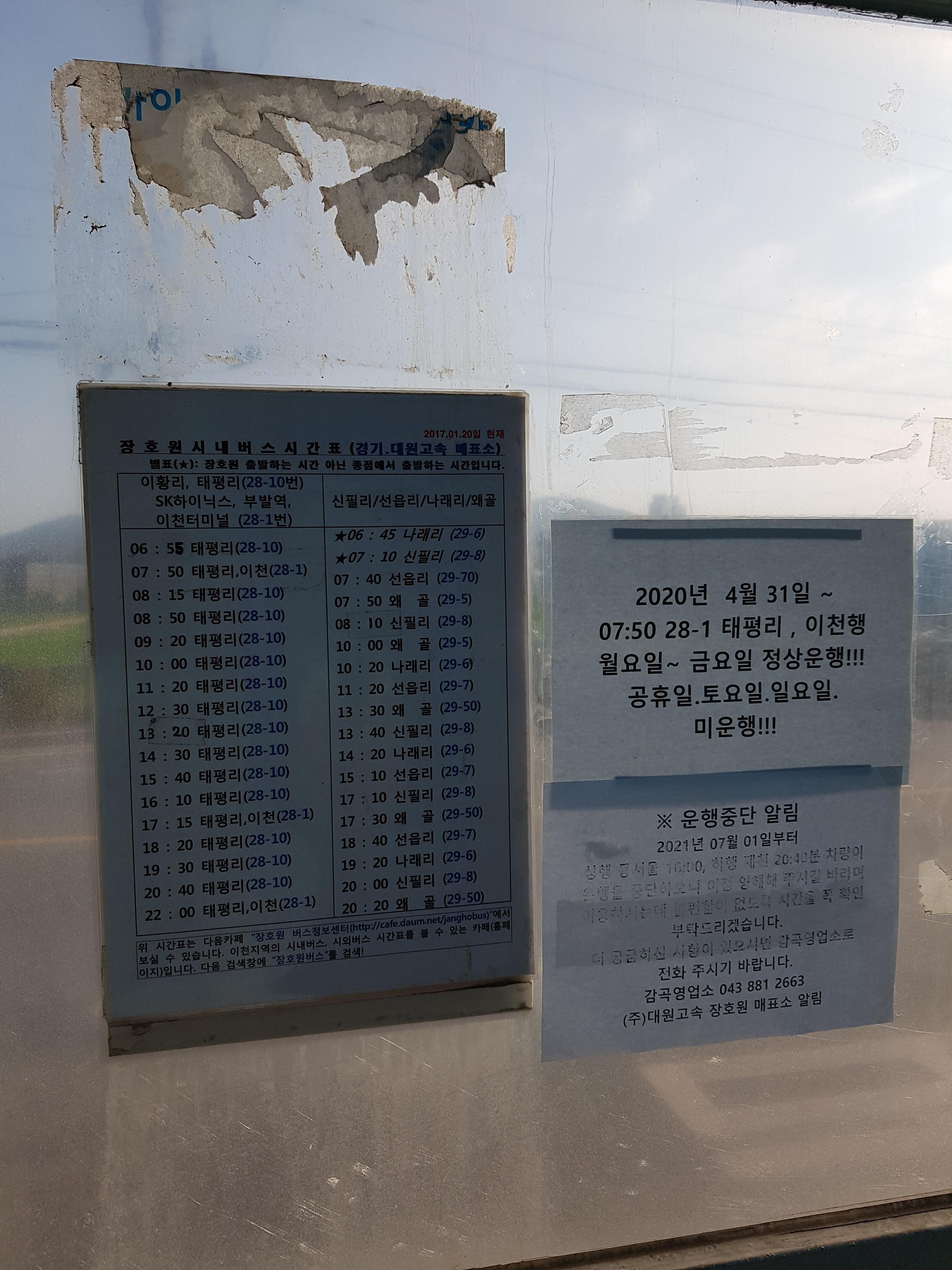 장호원 터미널의 공지사항은 이렇게 A4용지로 통보된다. 대부분의 공지사항은 버스가 없어지는 통보다. 아무래도 장호원의 인구가 조금씩 줄고 있다보니 장호원터미널의 버스 노선도 점차 사라질 듯하다. 정말 충격적인 것은 장호원에서 이천 시내로 가는 버스가 코로나로 인해 전부 사라졌다는 것이다. 그래도 이천 시내로 가는 버스는 항상 사람이 많았는데 한 번에 싹 다 사라졌다. 이제 이천 시내로 가기 위해서는 하루 서너 번 밖에 없는 시내버스를 이용해야 한다.