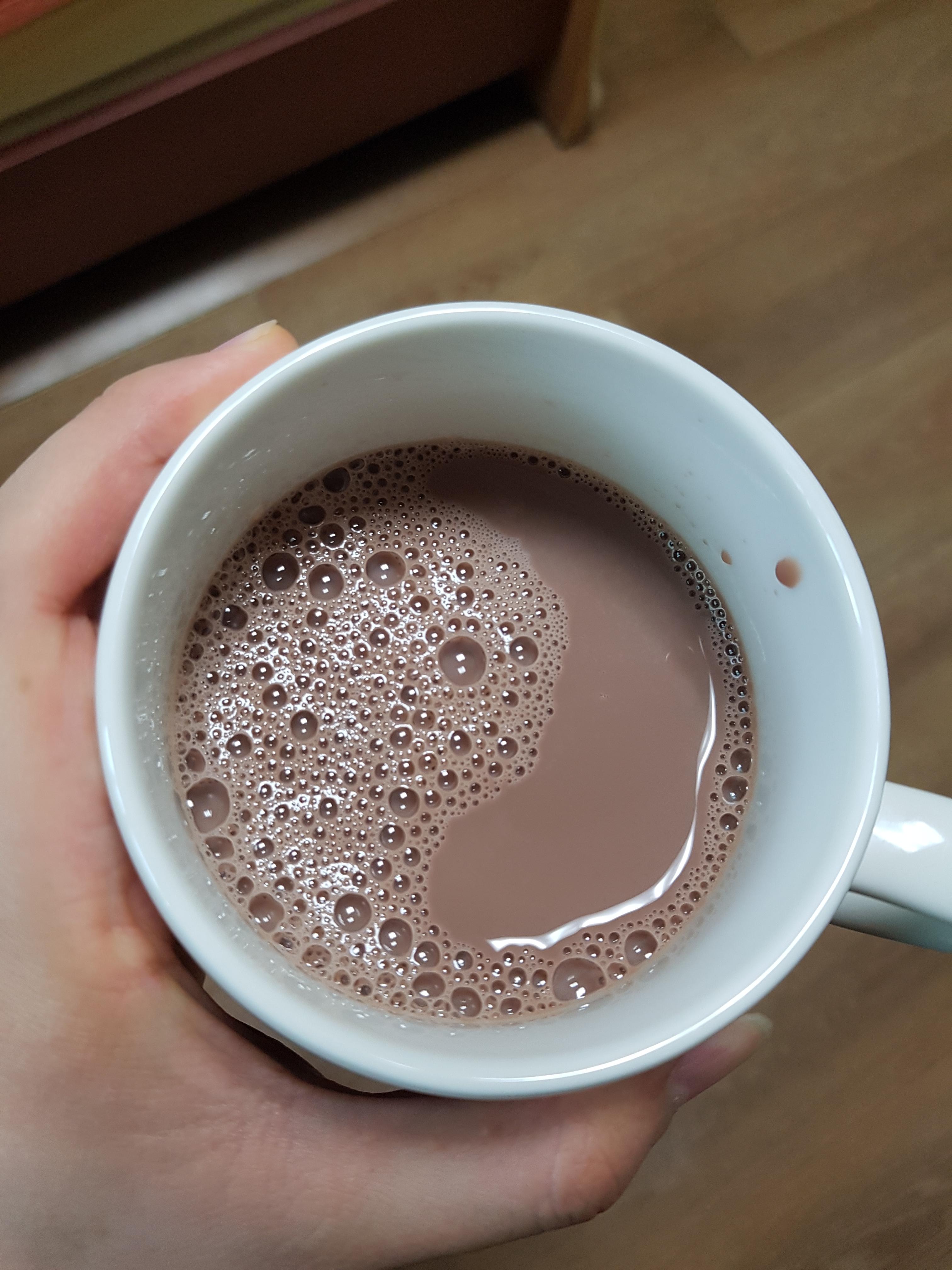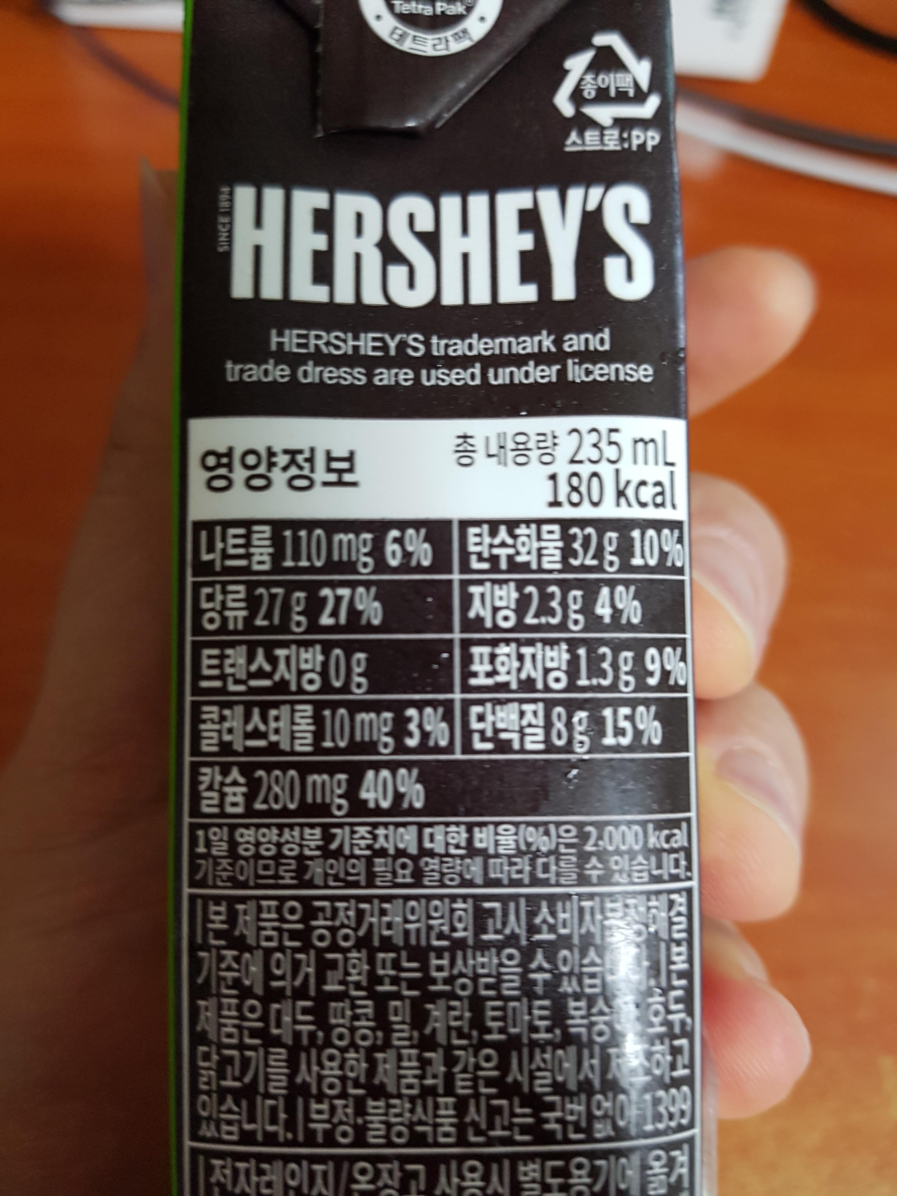 다 뜯고 나서 컵에 담았다. 허쉬 초콜릿 드링크는 235ml인데 생각보다 용량이 많다. 물론 190ml짜리 제품도 있기는 하지만 편의점에는 235ml짜리 제품만 팔았다. 중요한 점은 적지 않은 양이어서 달달함에 대한 갈증을 은근히 잘 해결해준다는 것이다.