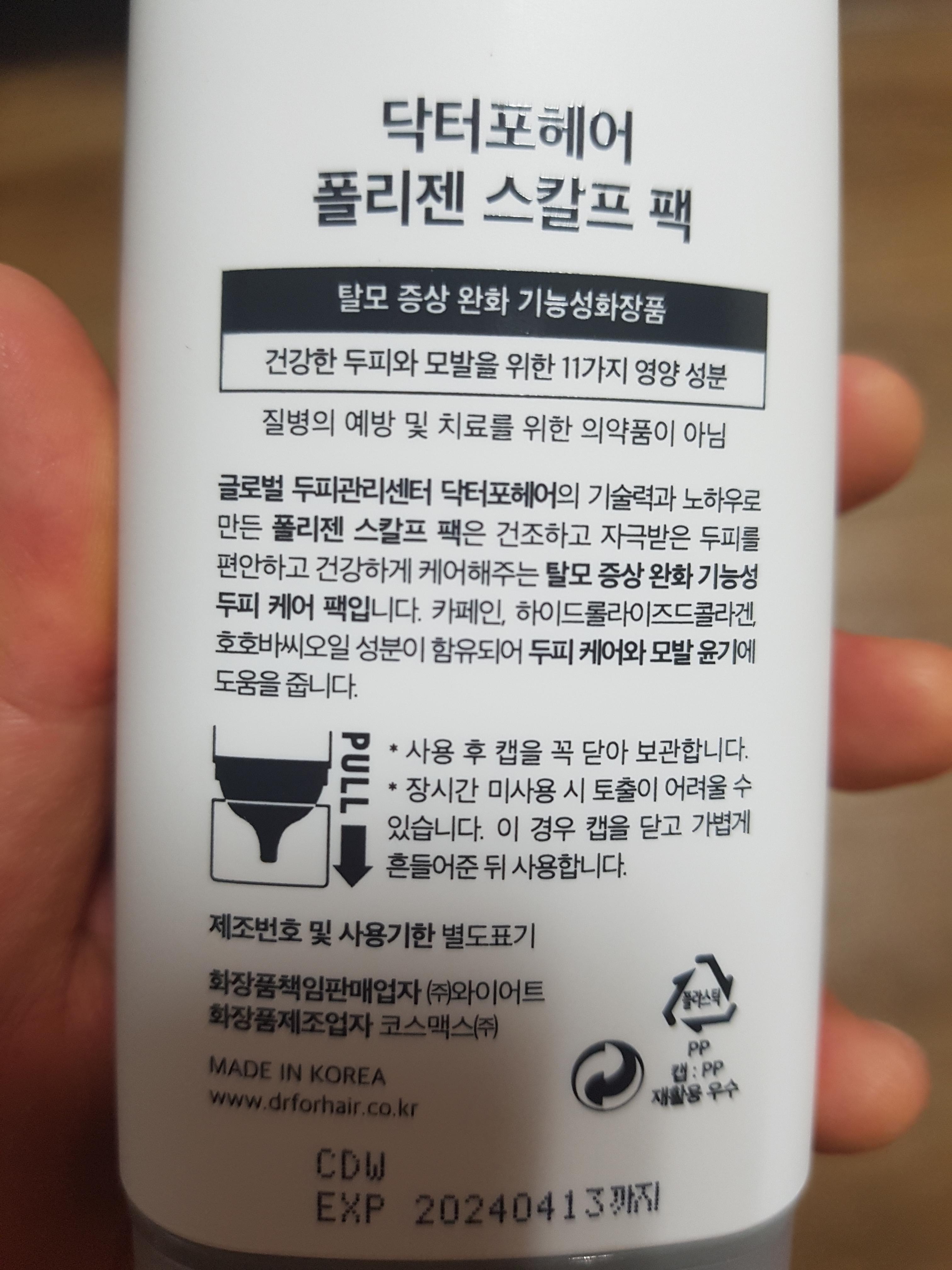 닥터 포헤어 두피 팩을 구매하기 전에 사용법에 대해서 말이 많았다. 바로 이 구멍이 너무 작아서 두피 팩을 짜서 사용하기가 매우 어렵다는 것이다. 실제로 제품을 보면 구멍이 작긴 작다. 치약을 짜는 것보다도 더 힘이 들 수도 있지만 이건 사용하는 사람마다 다르게 느낄 것 같다.