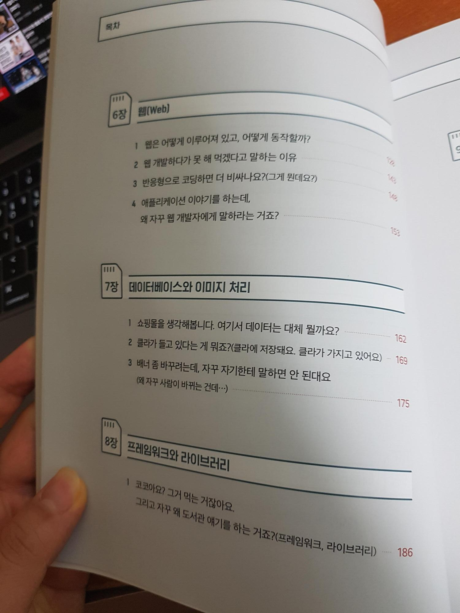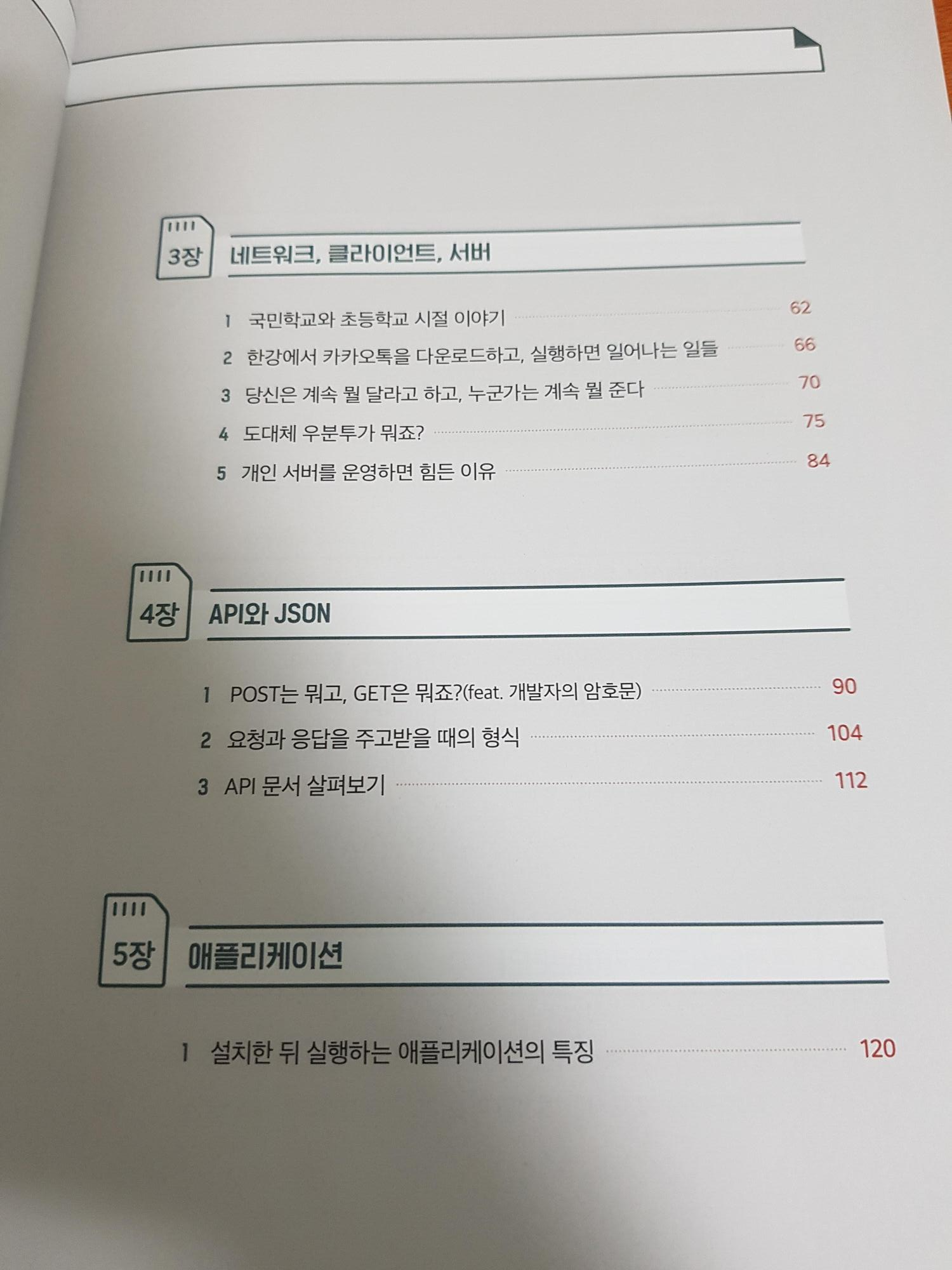 목차 역시 우리가 평소에 많이 들을 수 있는 말로 이루어져있다. 흔히 개발자가 되려면 무엇부터 해 야하냐는 질문을 할 때 들을 수 있는 대답을 제목으로 차용하면서 개발이라는 분야에 더 친근하게 다가갈 수 있다. 그런 질문을 시작으로 프로그래밍 언어와 데이터베이스, 네트워크 등이 어떻게 연결되고 어떻게 사용되어있는지 자연스럽게 설명해준다. 평소에 그냥 얼핏 들어본 말들을 이 책을 통해서 좀 더 구조적으로 이해할 수 있고 애매하게 알았던 것들을 더 명확하게 이해하는 데에 큰 도움을 준다.
