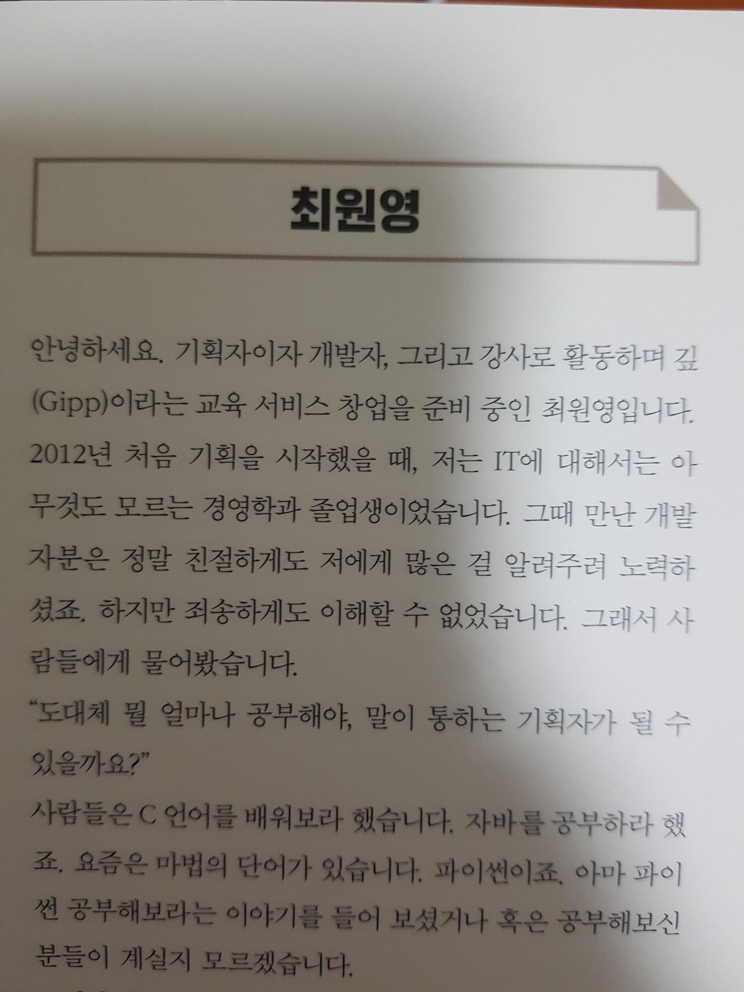 또한 저자는 우리와 비슷한 처지에 있었다. 저자는 비전공자였고 개발을 처음 공부할 때에 무엇부터 해야할지 모르는 사람이었다. 딱 우리의 모습이다. 그렇기 때문에 우리가 겪고 있는, 또 겪을 것들에 대해서 비전공자의 입장에서 잘 설명하고 있다. 왜 우리는 자바를 배우라는 소리를 듣는지, 왜 파이썬을 배우라는 소리를 듣는지 등을 아무것도 모르는 개발자 지망생의 시각에서 잘 서술하고 있다. 그래서 더 쉽게 책의 내용이 들어오고 더 쉽게 이해할 수 있다.