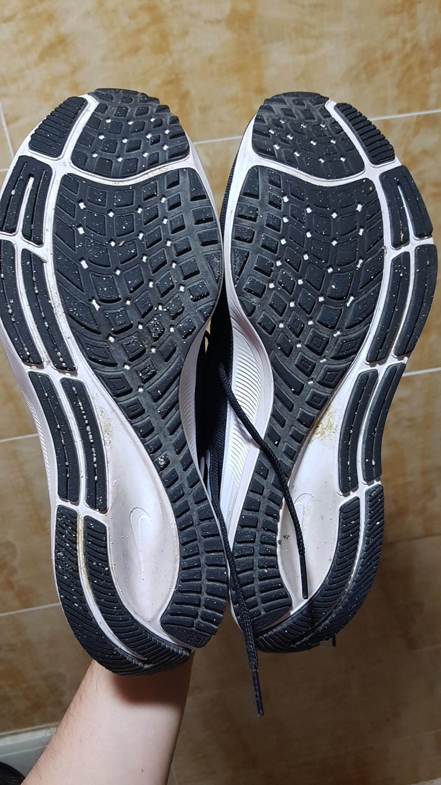 실제로 지금 기준으로는 약 3개월 정도 착용한 상태다. 신발 밑창은 꽤 두껍게 되어있고 런닝을 하면 밑창이 푹푹 들어갔다가 나오는 것을 느낄 수 있다. 주 5회 정도 3km를 달리는 내가 3개월 사용한 러닝화의 상태는 밑창에 눌린 자국이 있고 흙이 제법 묻어있는 상태다.