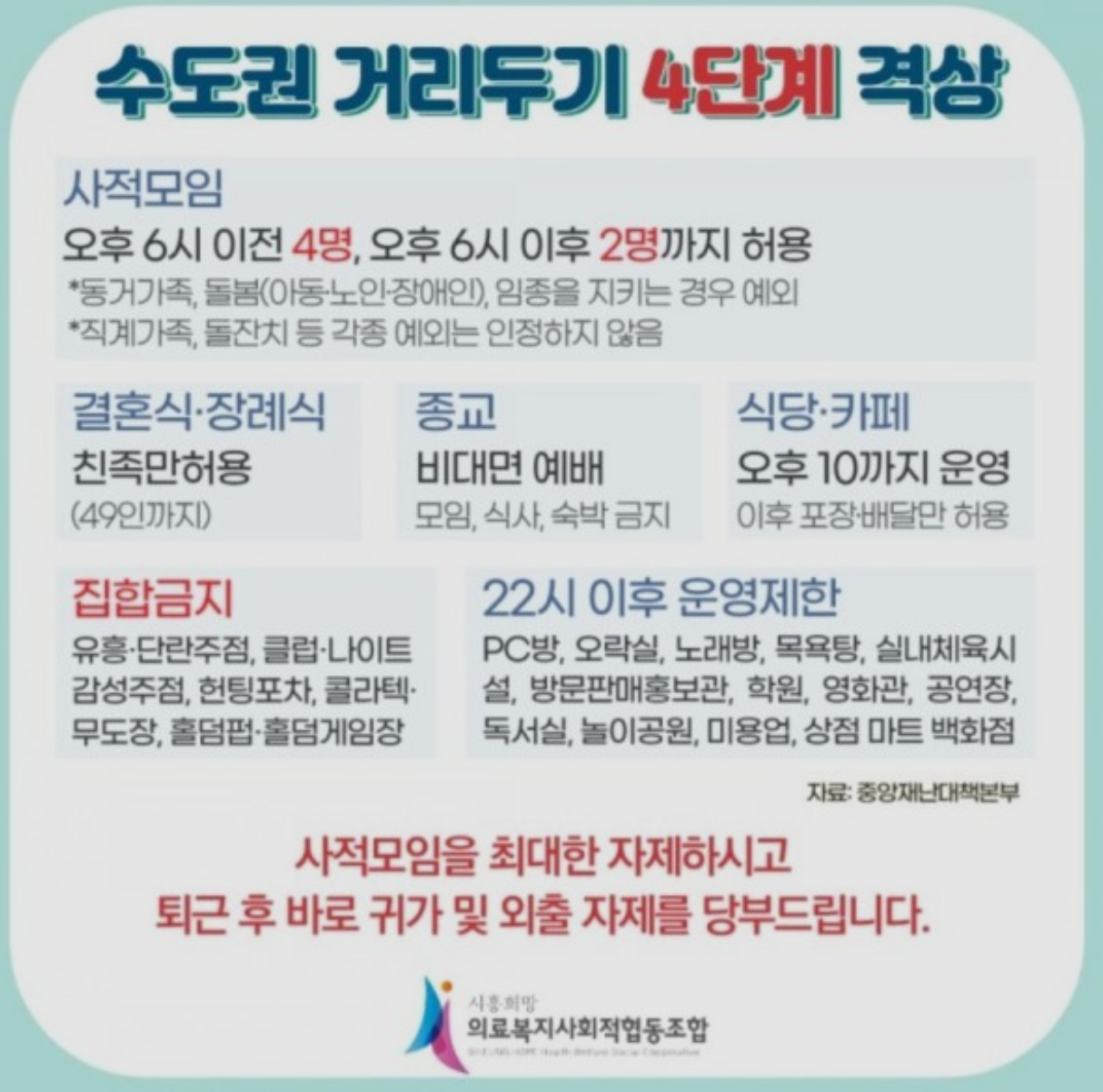 - 클럽, 나이트, 헌팅 포차, 감성주점 등은 집합 금지