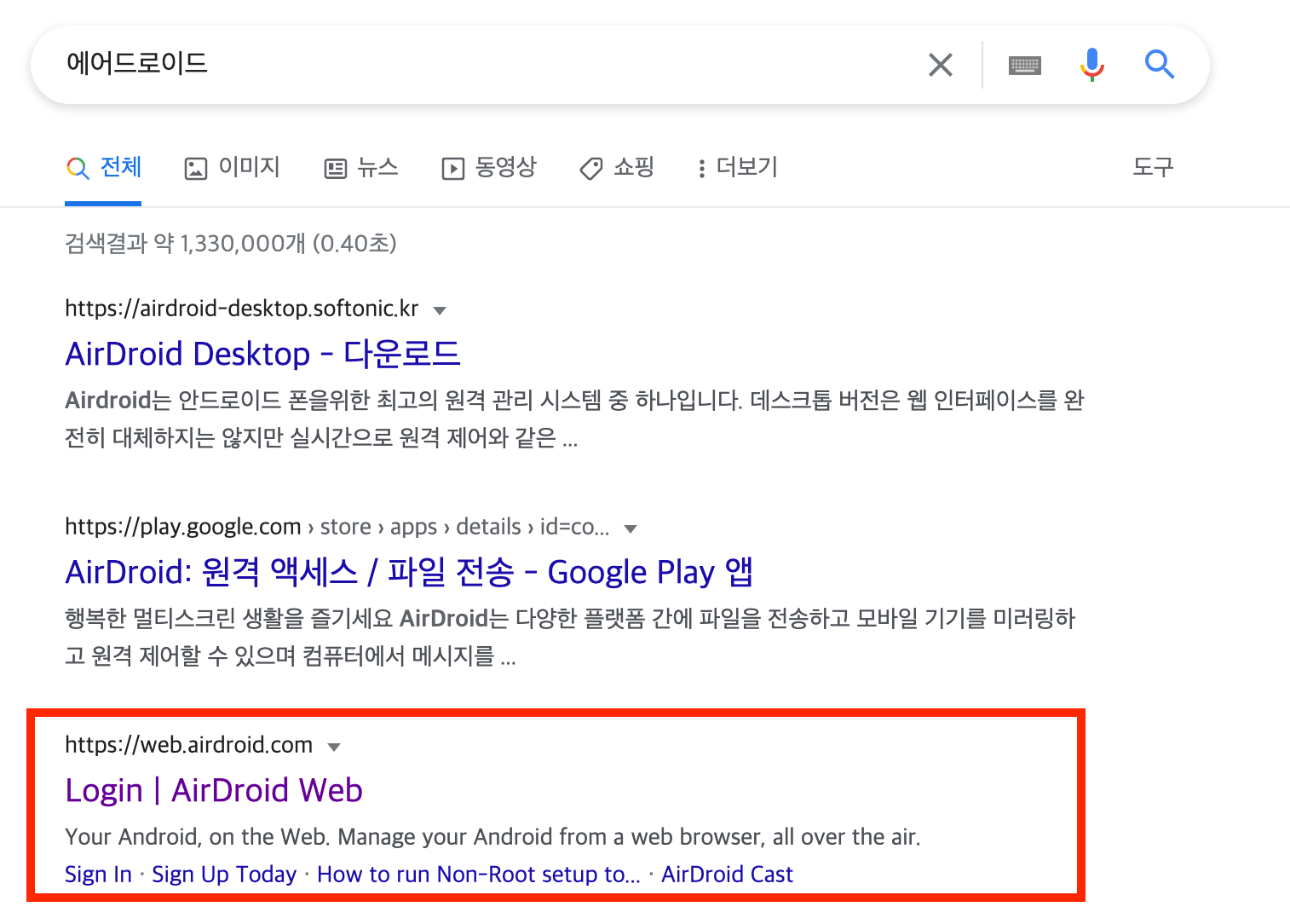 그 다음에 에어드로이드를 검색하고 빨간색으로 표시한 사이트(https://web.airdroid.com)로 들어간다