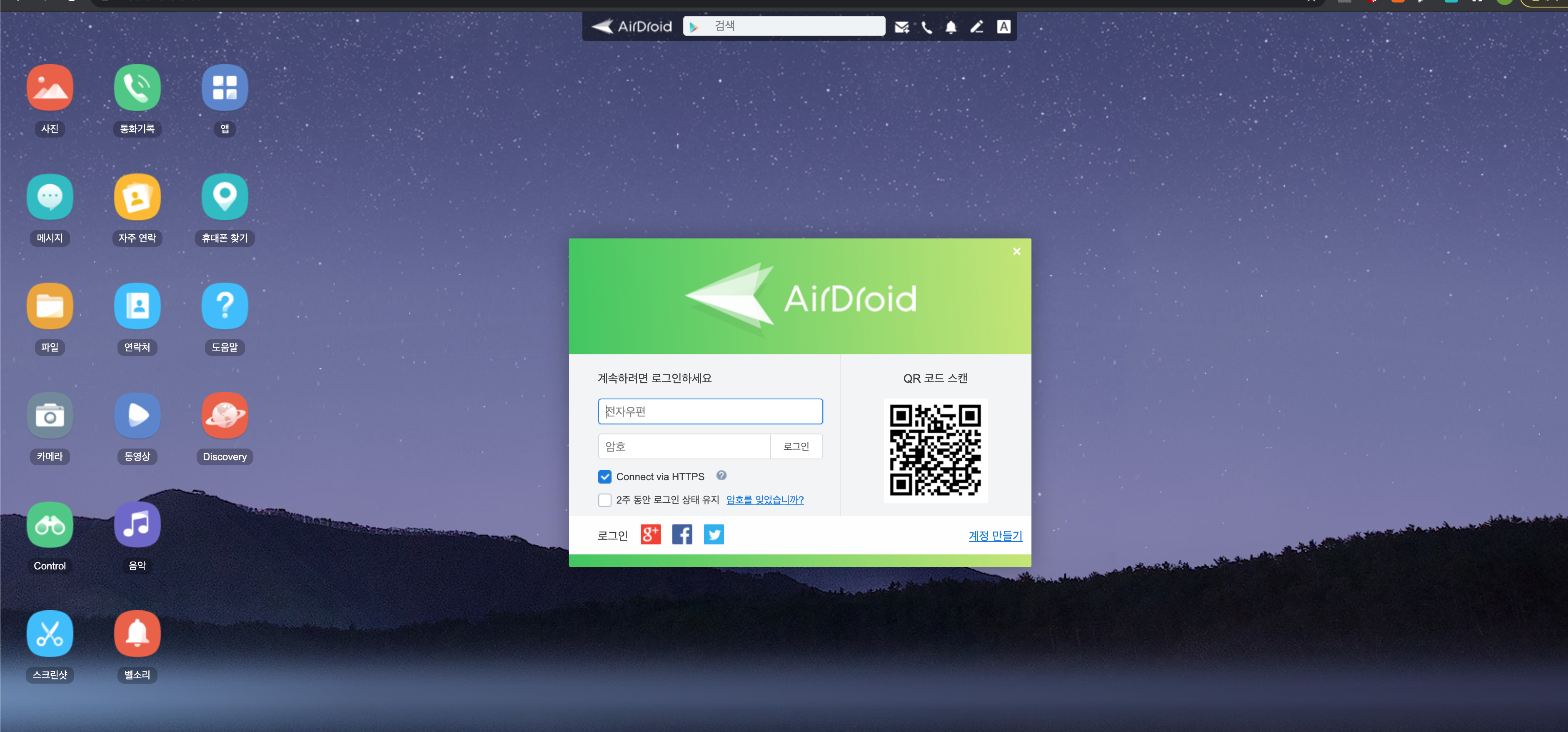 사이트로 들어간 다음에 아까 스마트폰에서 로그인한 아이디로 동일하게 로그인한다. QR코드로도 가능하다.