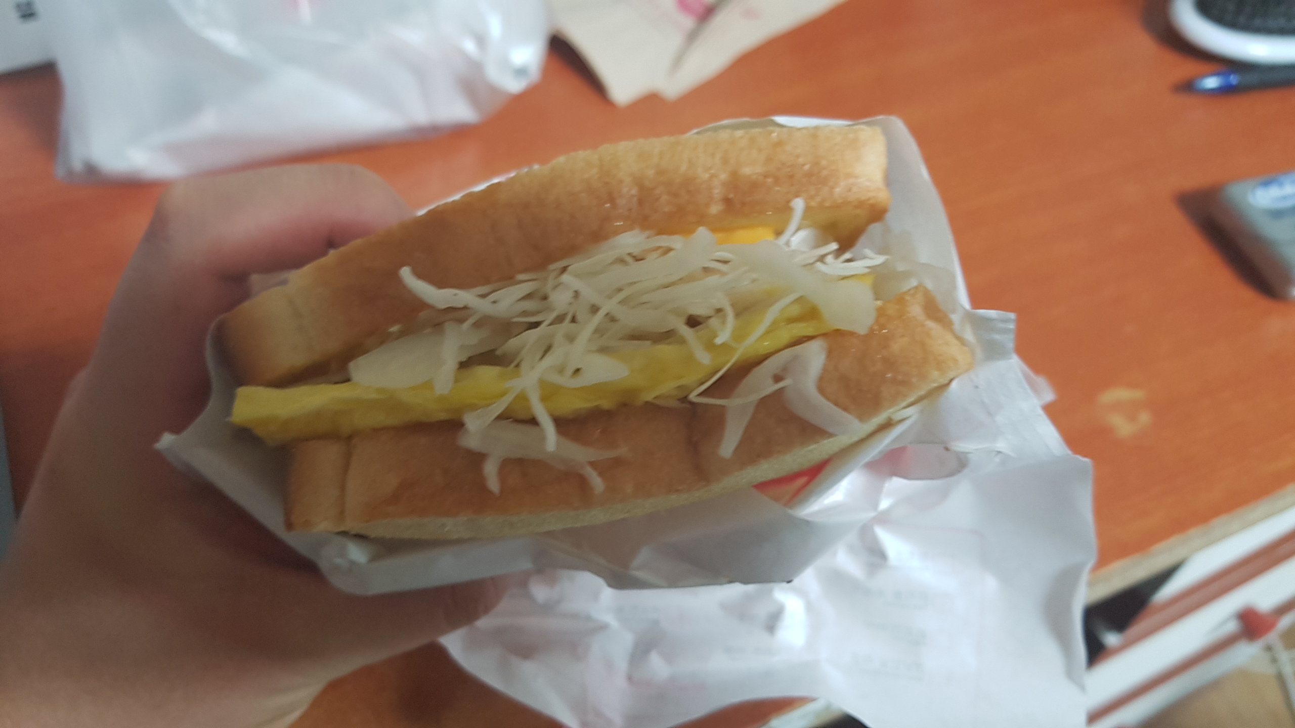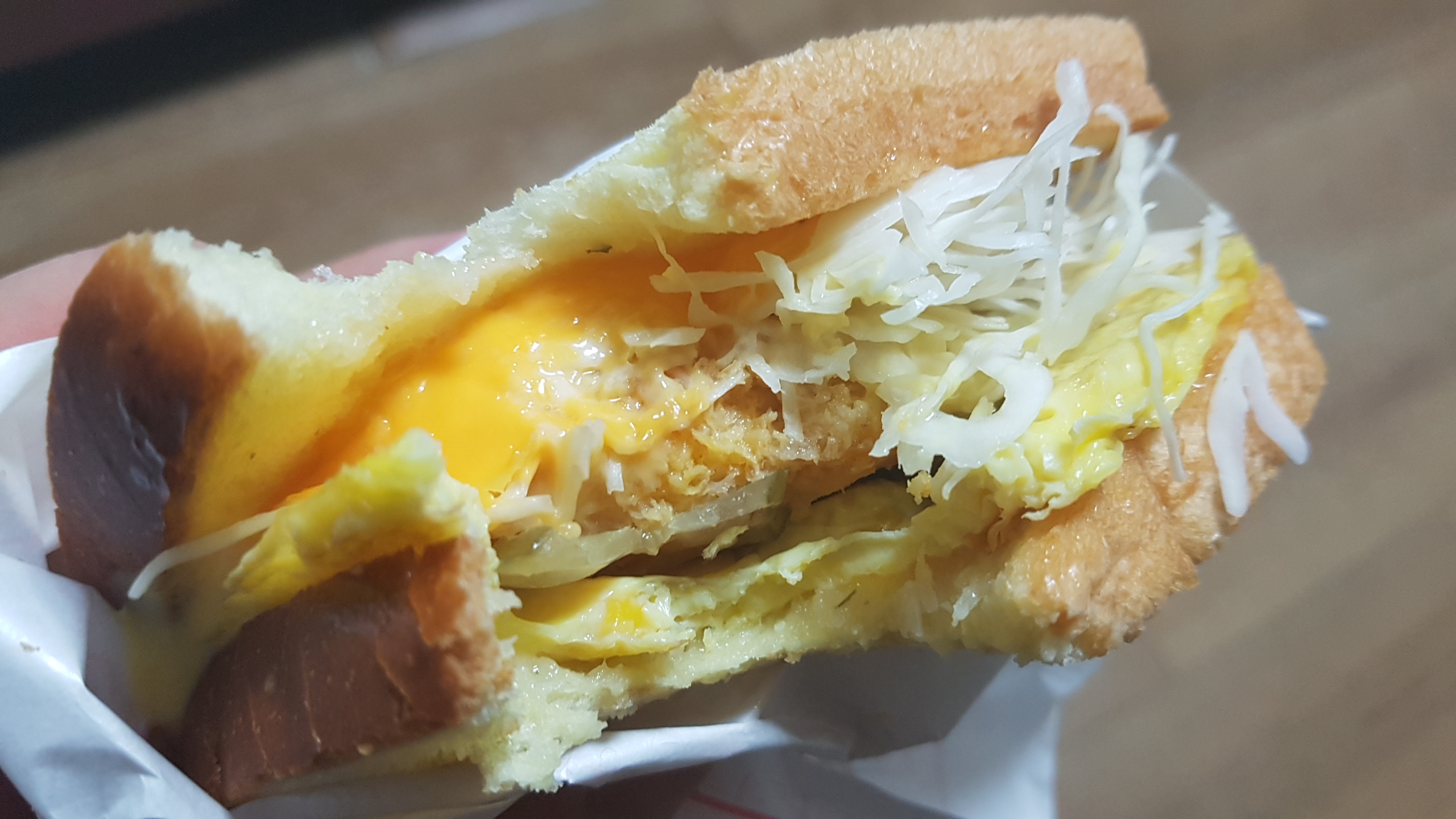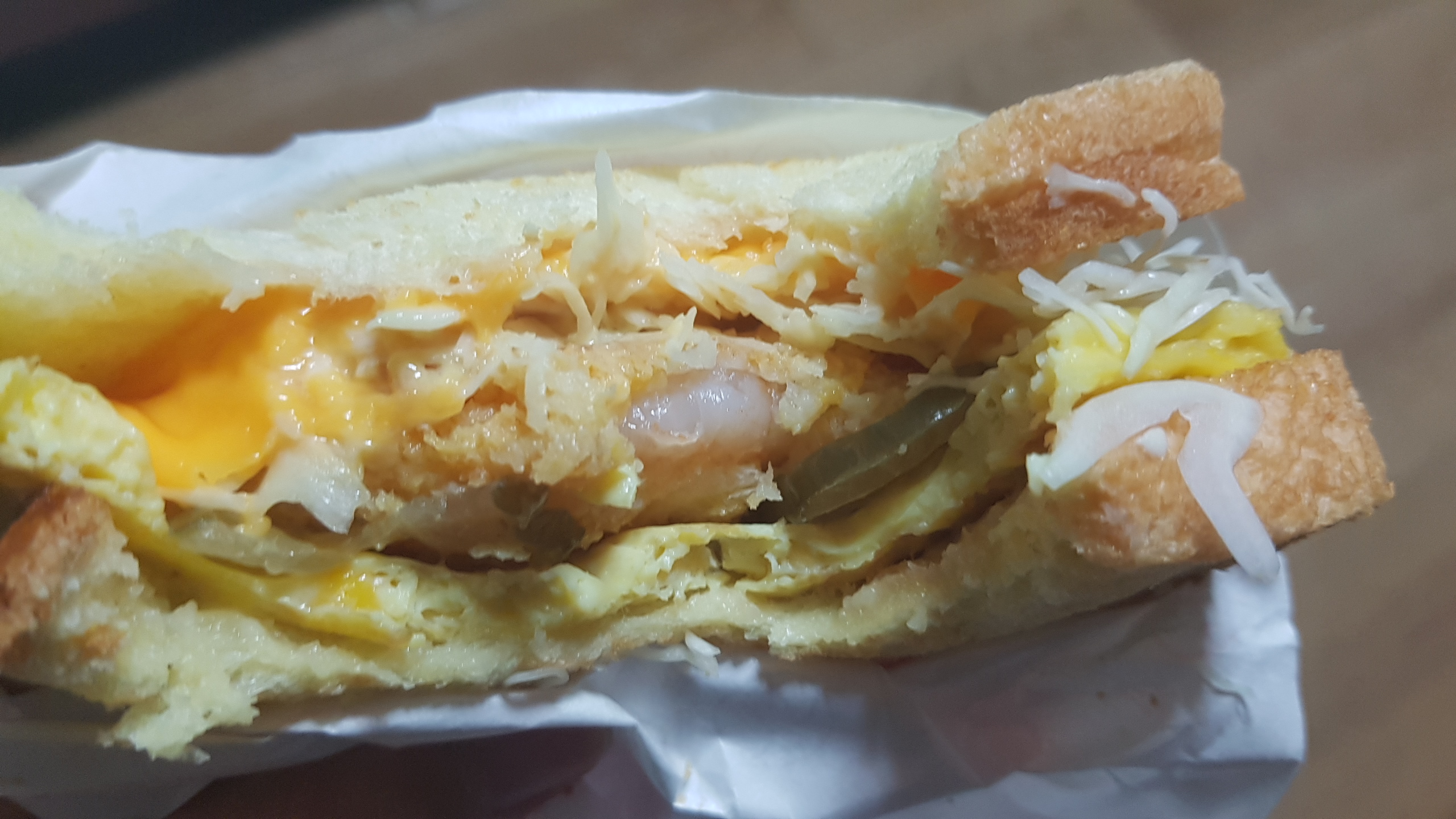 새우토스트 안에는 양배추와 계란, 치즈, 쌈무, 피클 그리고 새우 패티가 들어간다. 개인적으로 토스트든 햄버거든 채소가 무조건 들어가야 한다고 생각한다. 영양소도 더 풍부하고 무엇보다 씹는 맛이 좋기 때문이다.