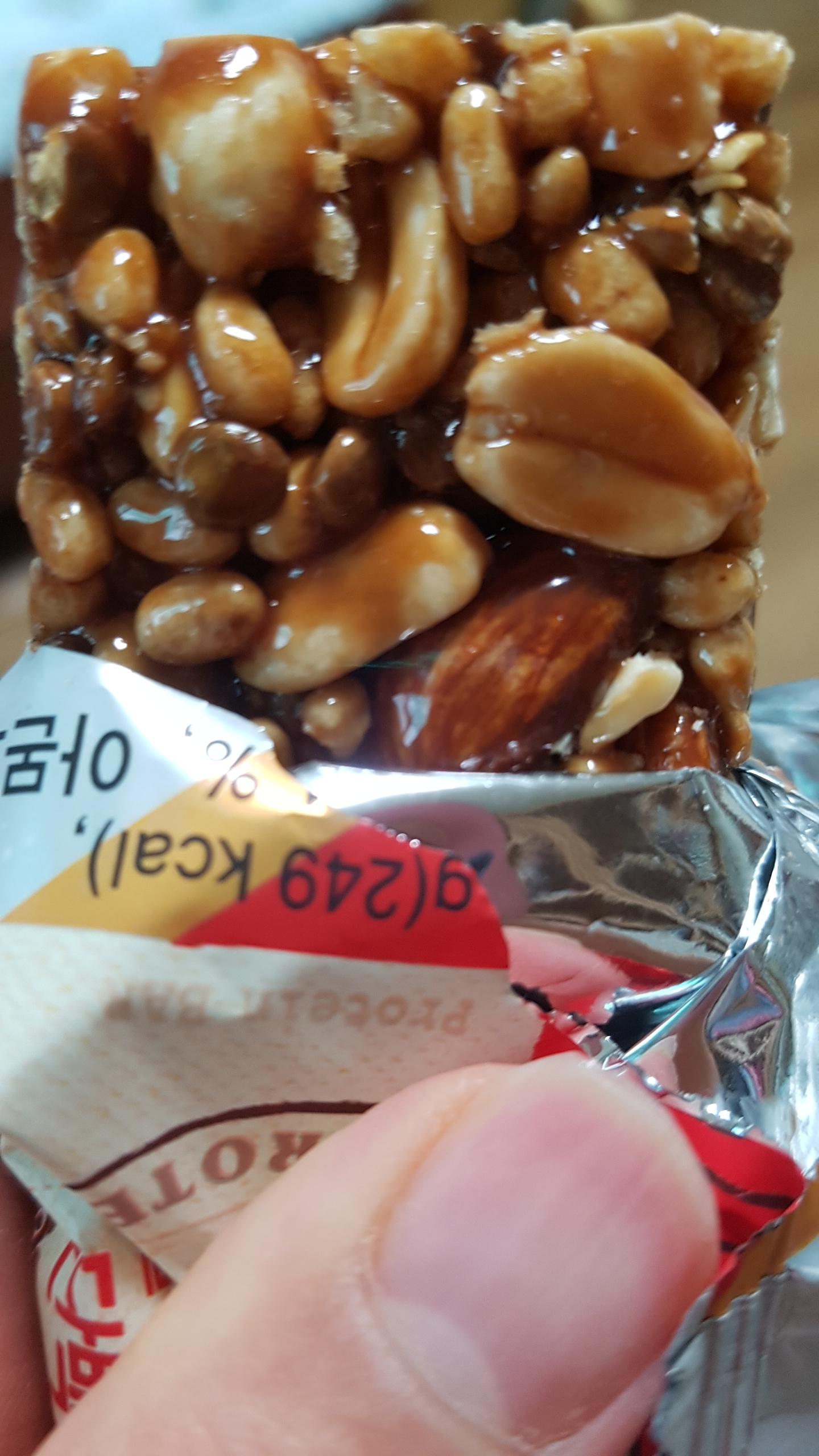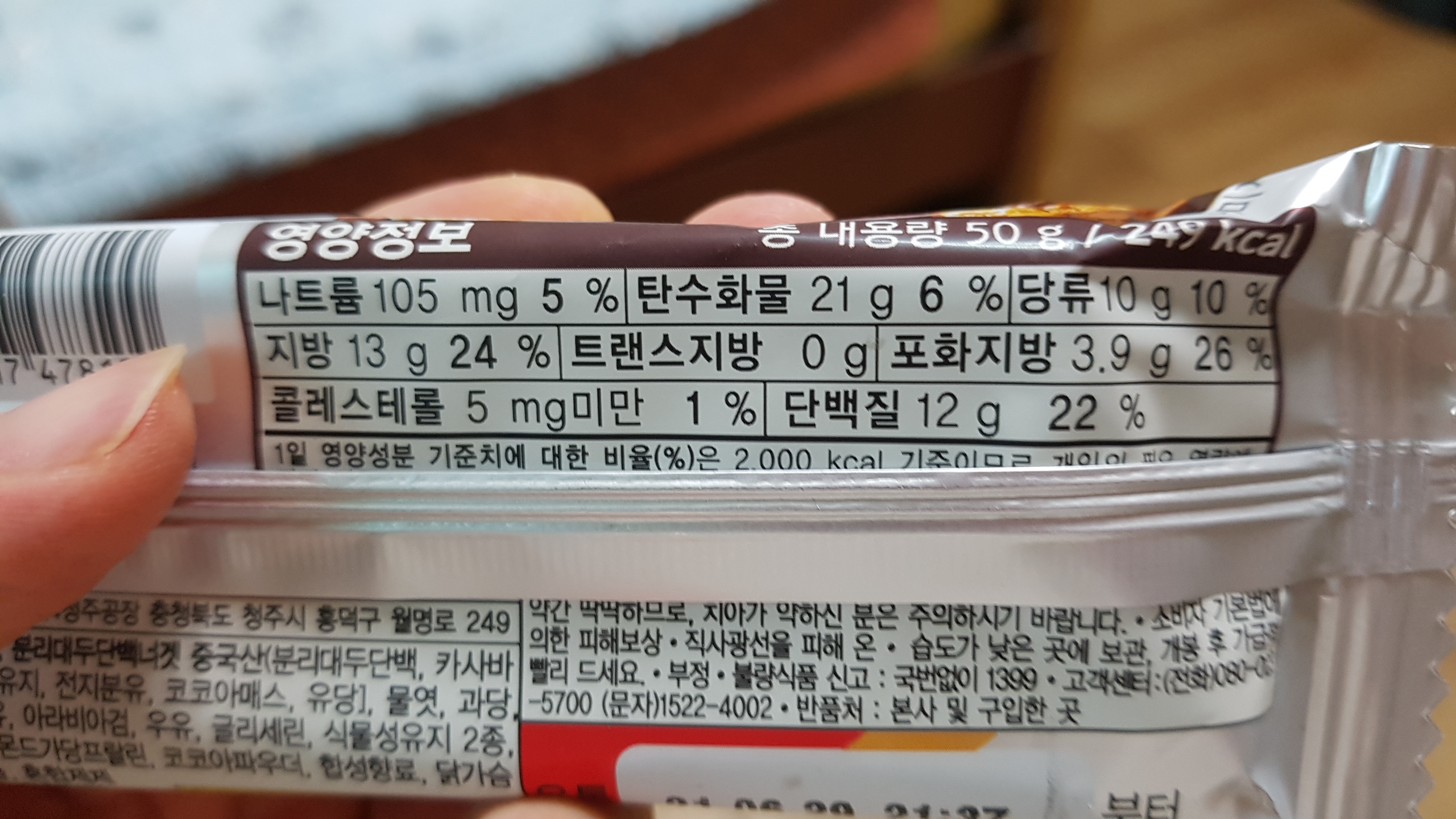 물론 좀 아쉬운 부분도 있다. 초코가 같이 들어있기 때문에 지방이나 당류도 좀 들어있는 편이다. 하지만 핫브레이크나 스니커즈처럼 우리가 자주 먹는 초코바에 비해서 단백질 함량이 높으며 상대적으로 영양소가 고루 있다는 점이다.