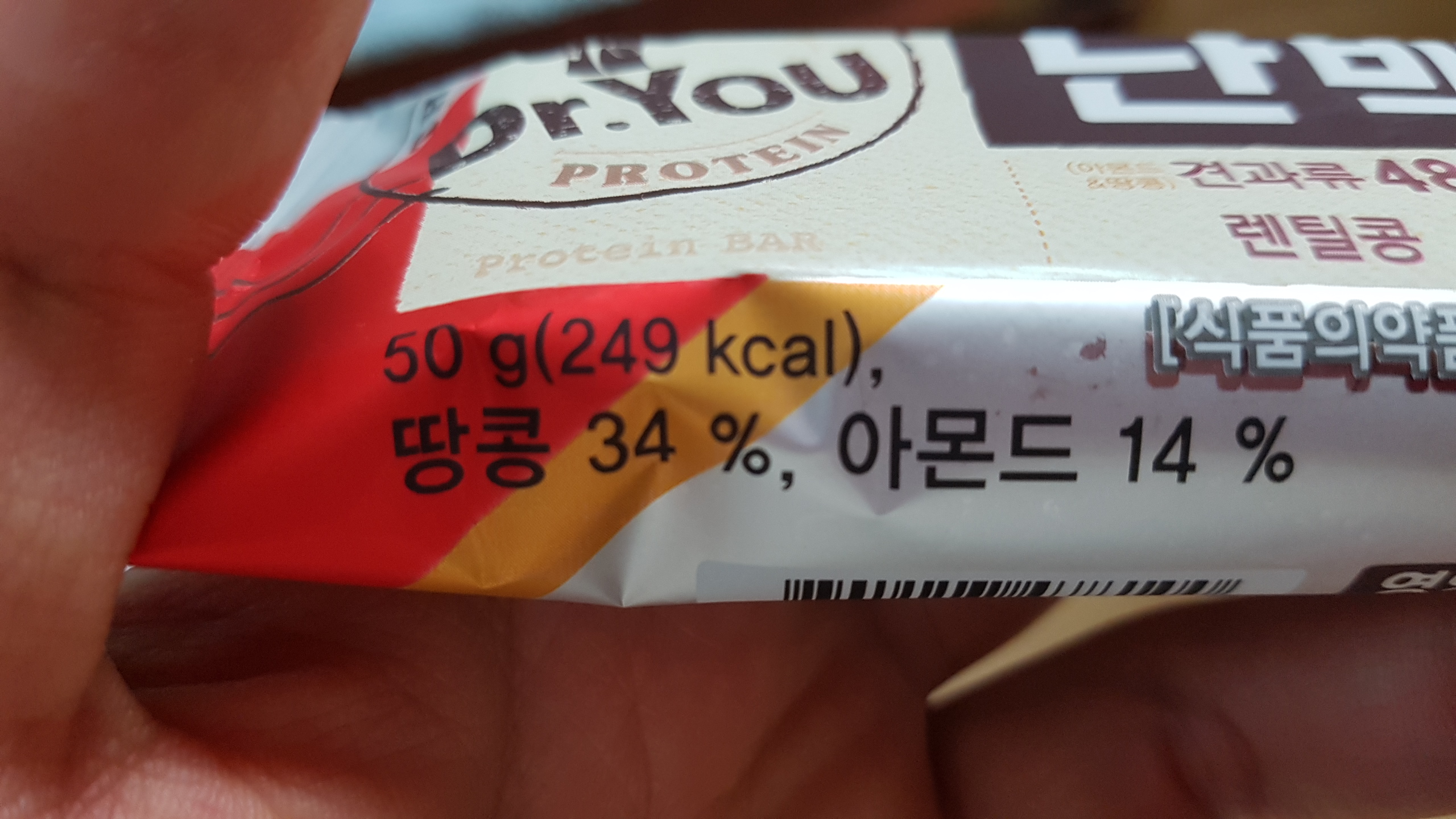 그에 비해서 닥터유 단백질 바는 단백질은 물론이고 땅콩이나 아몬드 등 견과류까지 함유되어있어서 단백질뿐 아니라 힘을 낼 수 있는 여러가지 영양소들도 있다. 칼로리는 249kcal이다. 높다고 생각할 수도 있지만 실제로 닥터유 단백질바 하나만 먹어도 포만감을 느낄 수 있었다.