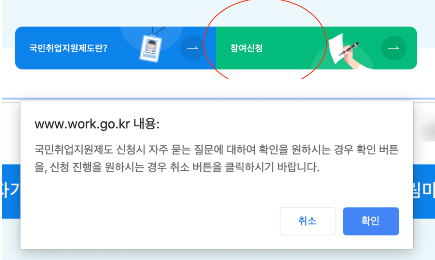 그러고 나서 국민 취업지원제도 공식 홈페이지에 들어가서 참여 신청을 누른다. 여기서 중요한 점은 참여 신청을 누를 경우 이렇게 주의 사항이 나오는데 여기서 반드시 취소를 클릭해야한다는 것이다. 무턱대고 확인을 누르면 다른 질문 페이지로 넘어가기 때문에 반드시 취소를 누른다.