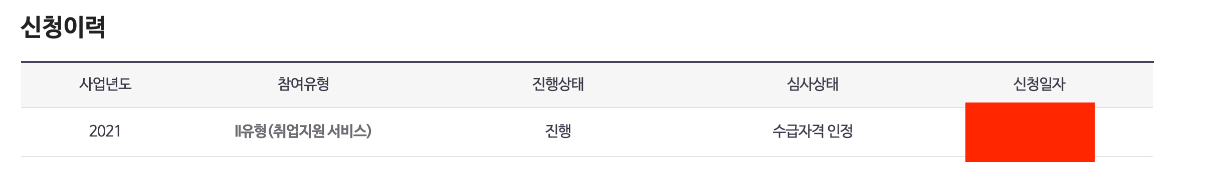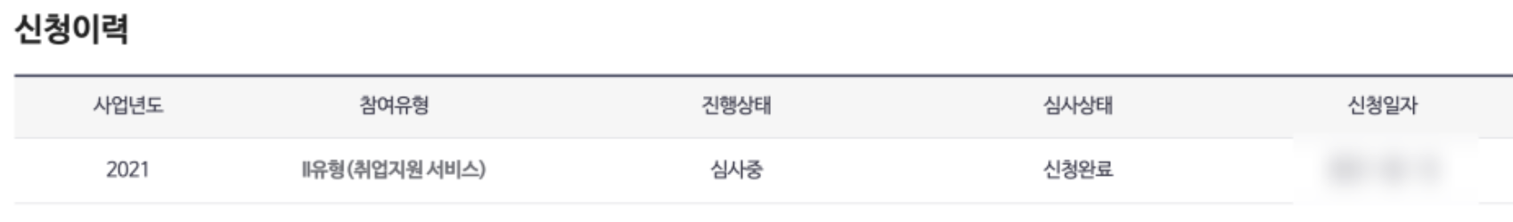 그렇게 체크를 다 한 다음에 신청하기를 누르면 끝이 난다. 그러면 아래 화면처럼 진행상태에 심사 중이라고 표시가 된다. 이는 재산 조회 등으로 시간이 조금 걸리기 때문에 당장은 더 이상을 진행하기 어렵다. 최소 2주에서 한달 이상도 걸리는데 만약 한 달이 넘게 걸릴 경우 고용센터에 전화해서 본인의 신청 과정이 어느 정도 진행되었는지 물어보는 것이 좋다.