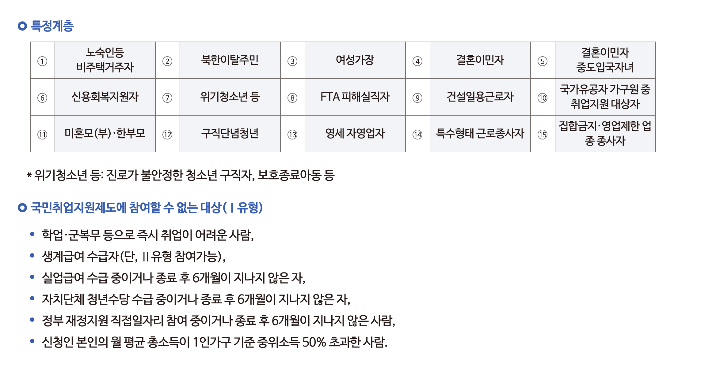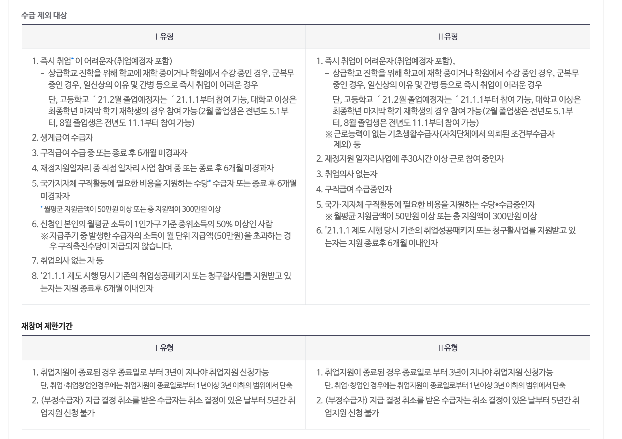물론 다음과 같이 1 유형에 참여할 수 없는 대상이 따로 있기는 하다. 실업급여를 받고 있거나 종료 후 6개월이 지나지 않은 경우, 생계급여 수급자, 즉시 취업이 어려운 사람 등은 받을 수 없다. 대신 실업급여를 종료하고 6개월이 지나지 않아도 2 유형은 신청이 가능하다. 또한 중위소득이 적정 금액보다 많은 경우 국민 취업지원제도의 혜택을 받을 수 없다.