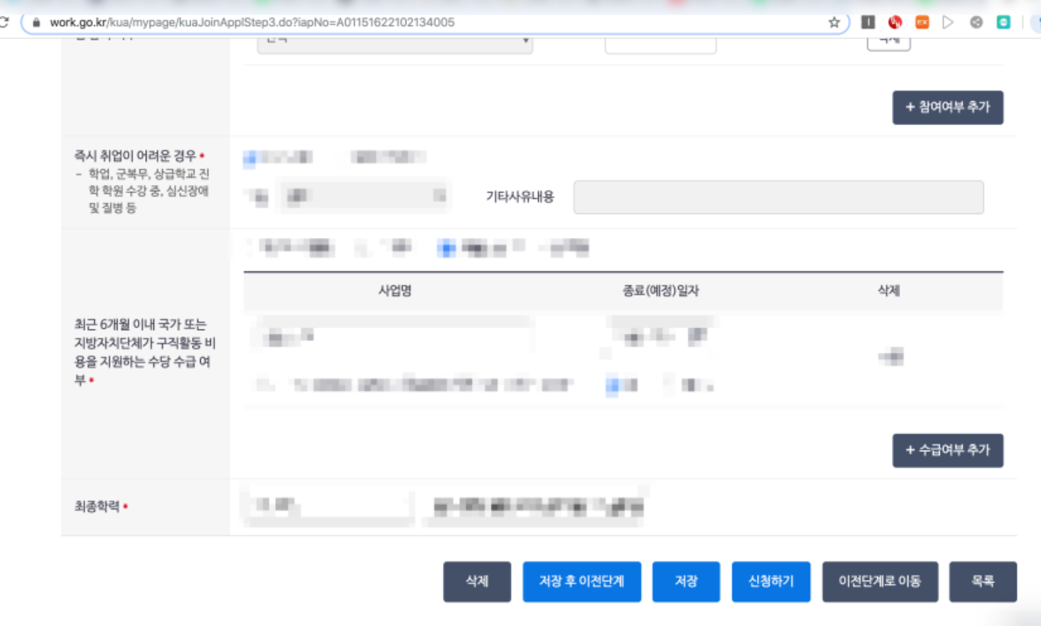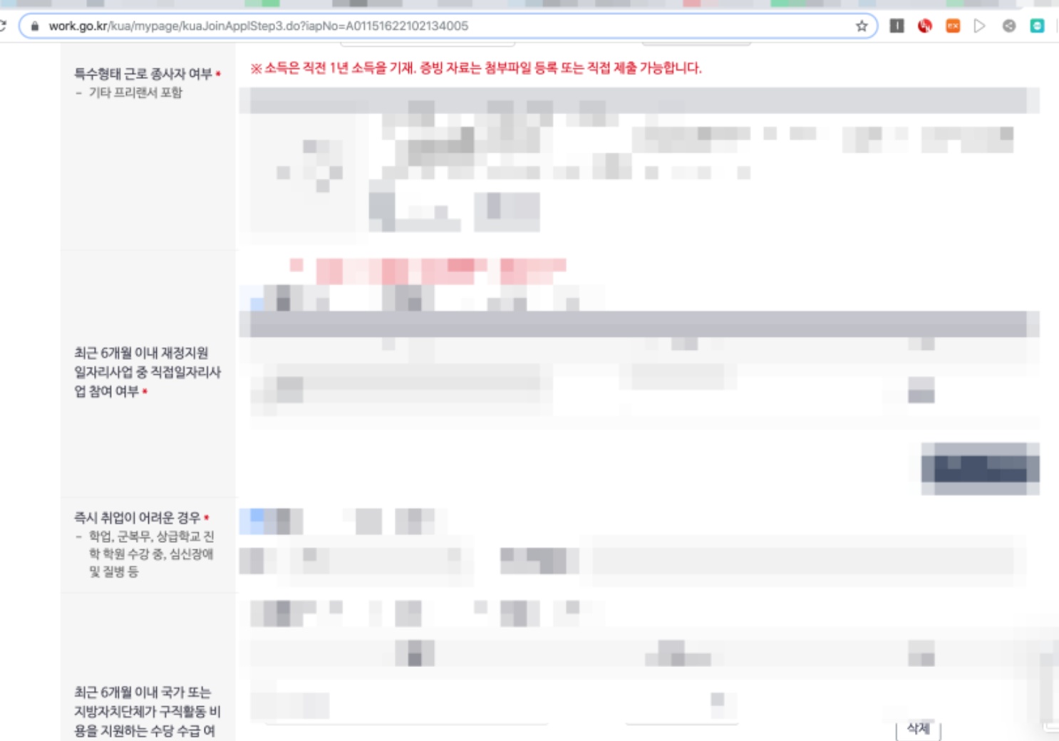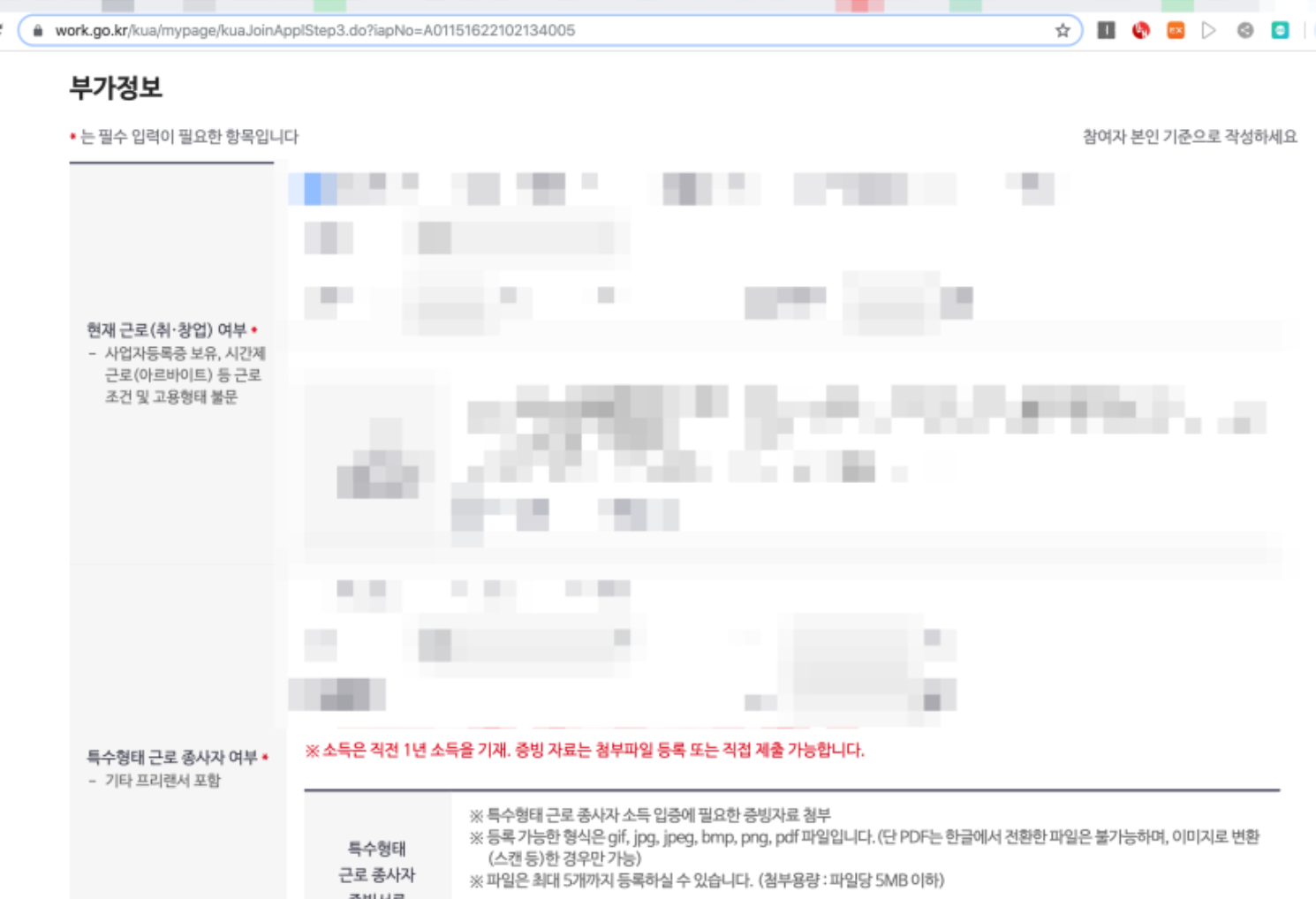 다음 단계로 이동을 하면 부가정보를 입력하는 부분이 나온다. 현재 나의 근로상태나 과거의 근로 여부 등을 물어본다. 그냥 있는 그대로 체크하고 대답하면 된다.