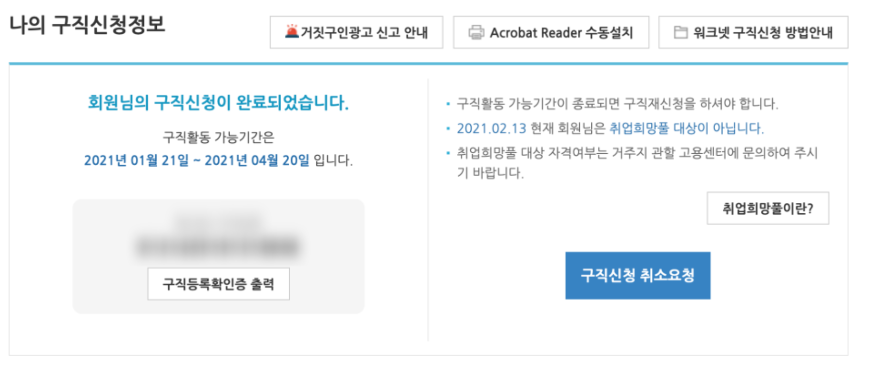그러면 아래와 같이 회원님의 구직신청이 완료되었습니다라고 뜬다. 이렇게 나오면 구직신청이 완료된 것이다. 이 구직신청은 3개월마다 연장을 하는 것이 좋다. 하지 않을 경우 진행하고 있는 프로그램에 대해서 불이익이 생길 수 있기 때문이다.