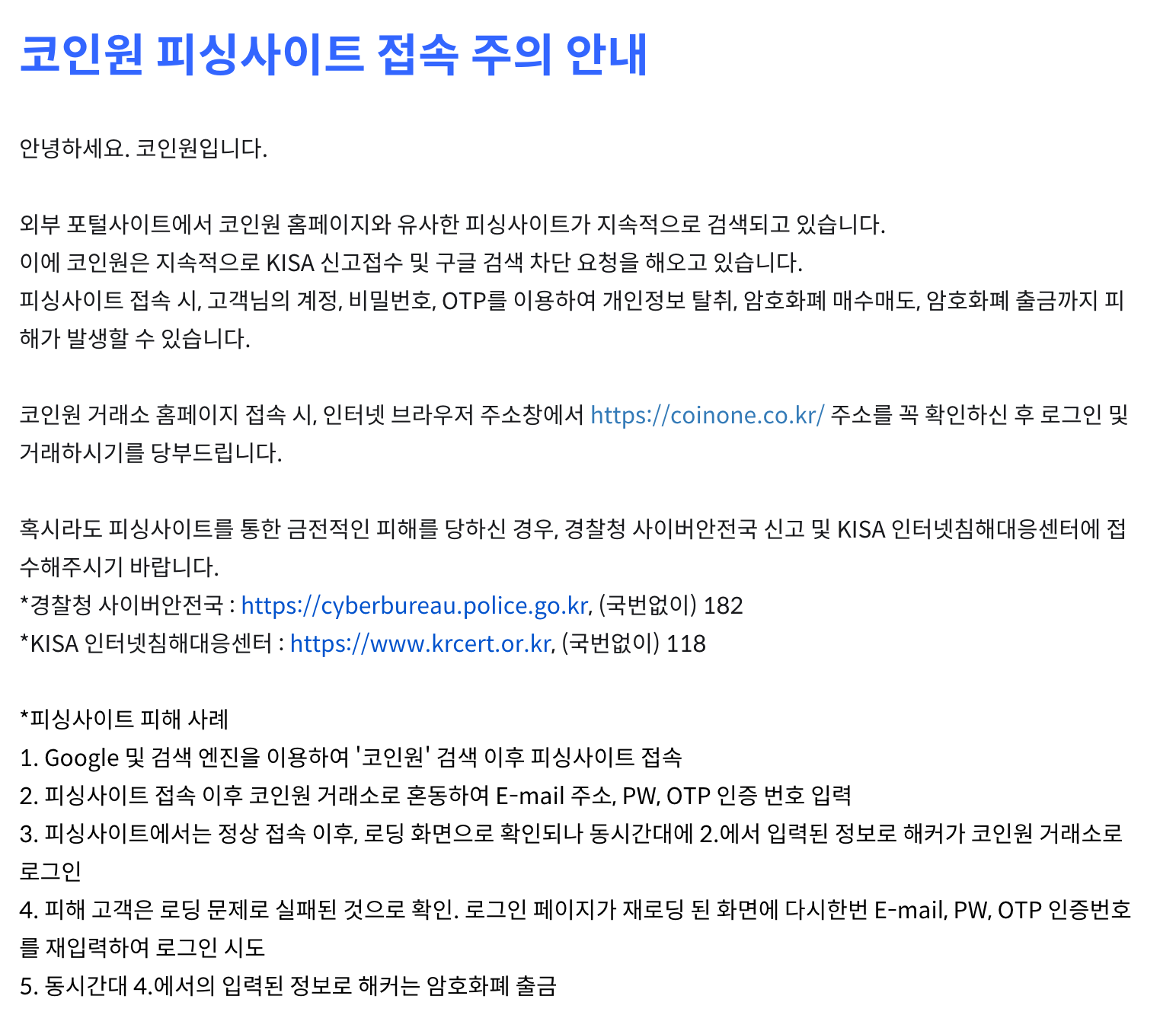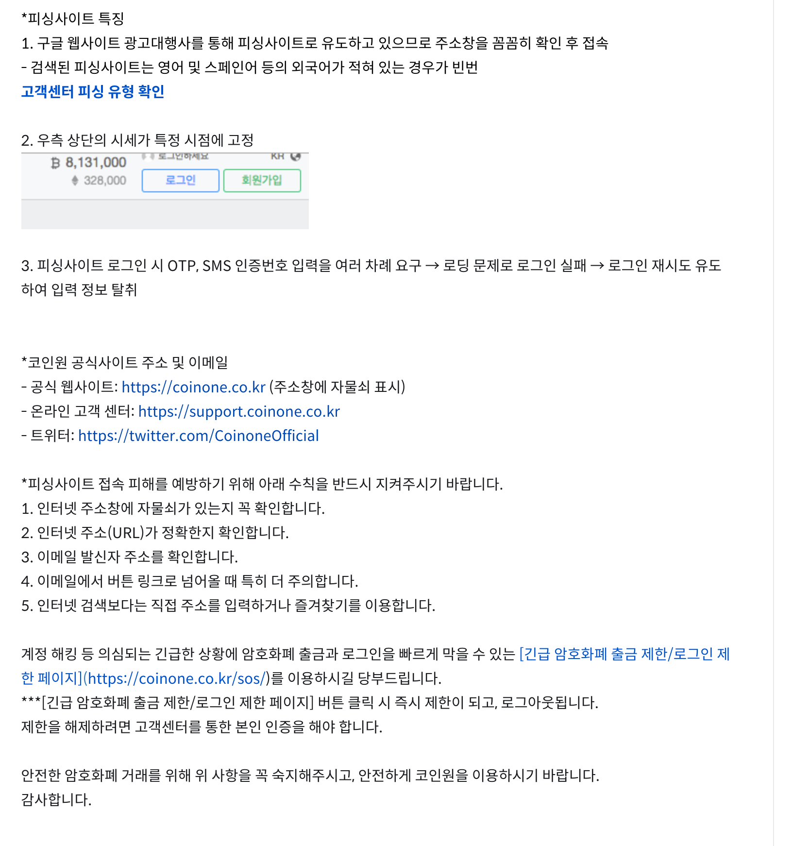 실제로 사기 문자로 온 URL을 접속할 경우 비밀번호같은 개인정보를 빼돌리거나 암호화폐 출금 등의 피해까지도 당할 수 있다는 것이 코인원의 공식적인 공지사항이다. 그러니 실제로 코인원에서 문자가 온다면 피싱 문자일 가능성이 높으니 의심하는 것이 좋을 것 같다. 특히 코인을 하는 투자자들에게 더욱 중요한 정보라고 생각한다.