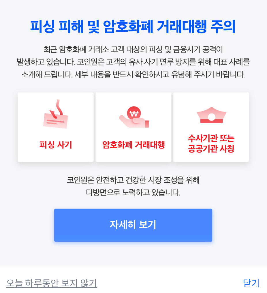 실제로 코인원 사이트로 들어가봤다. 아니나 다를까 나 말고도 나처럼 사기 문자를 받은 사람들이 정말 많은 듯했다. 코인원 사이트에서는 공식적으로 피싱 사기와 암호화폐 거래 대행 및 수사기관 또는 공공기관 사칭에 대해서 주의하라는 공지사항을 냈다.