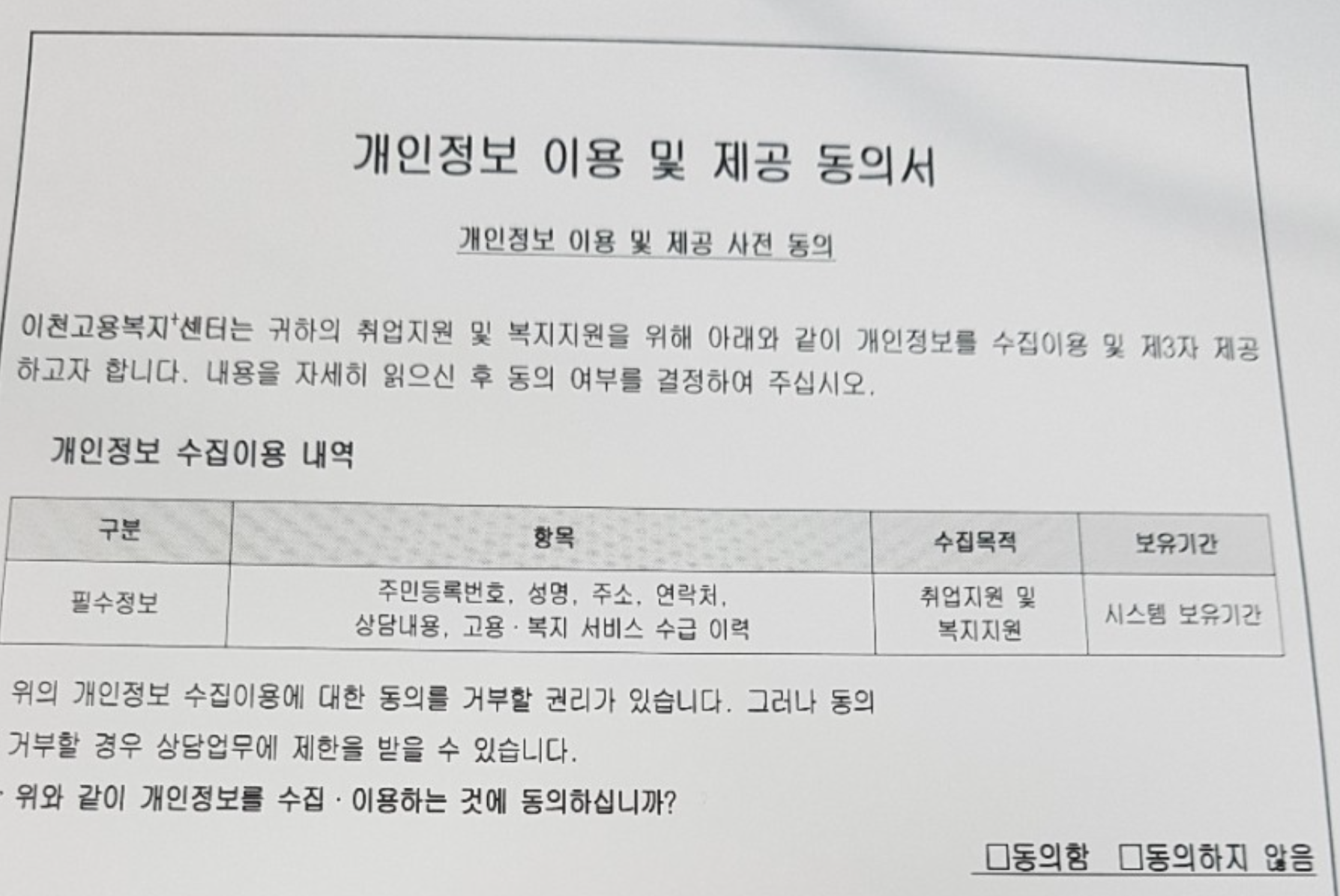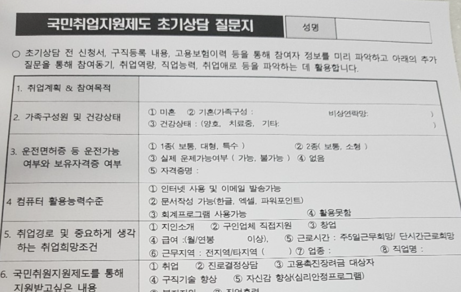 그렇게 상담 일정을 잡고 고용센터에 가면 여러가지 서류를 작성한다. 개인정보 이용 동의서와 초기 설문지 등 국민 취업지원제도 2 유형을 진행하기 위한 서류들이다. 내용을 읽어보고 하나씩 서명을 하면 된다. 막상 읽어보면 그리 어려운 부분은 없기 때문에 수월하게 진행될 거라고 생각한다. 모르는 부분이 있으면 상담사에게 직접 물어보면서 하면 된다.