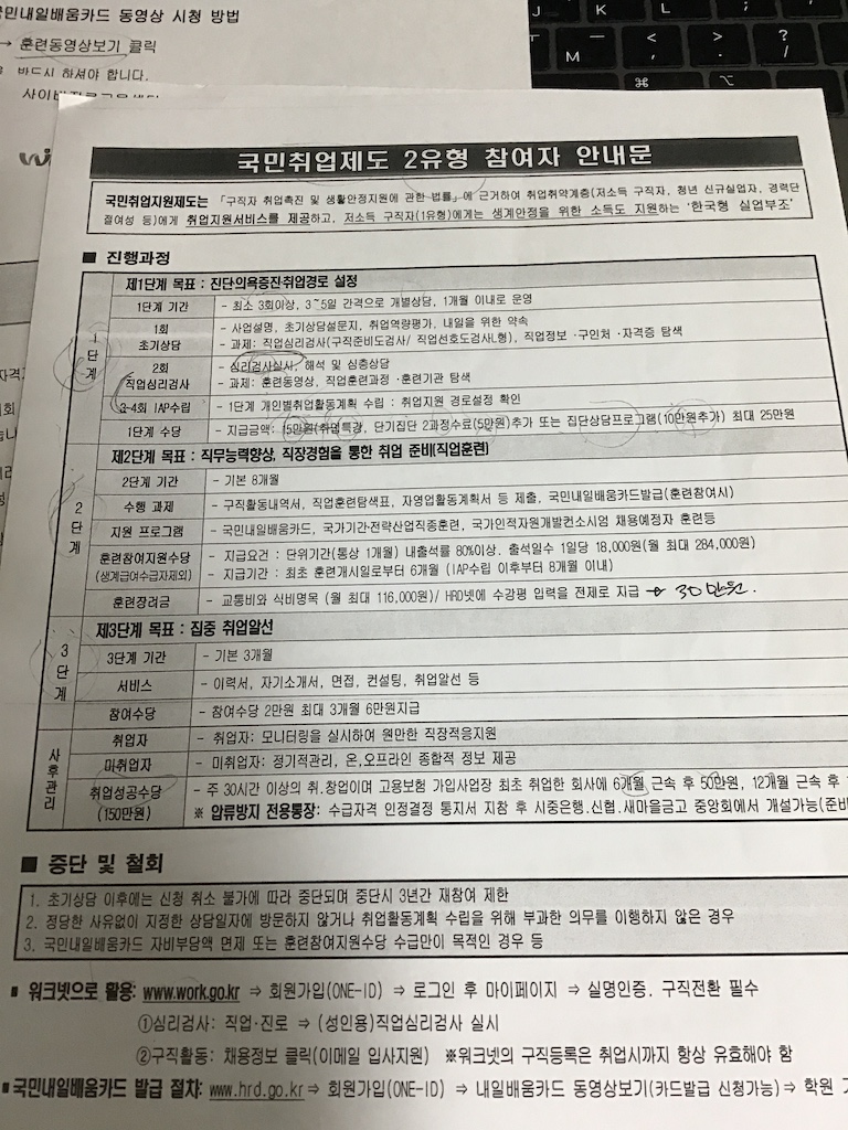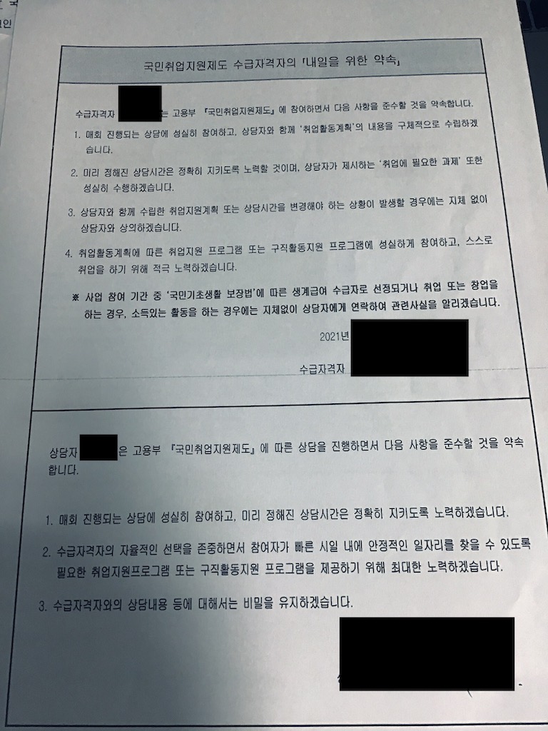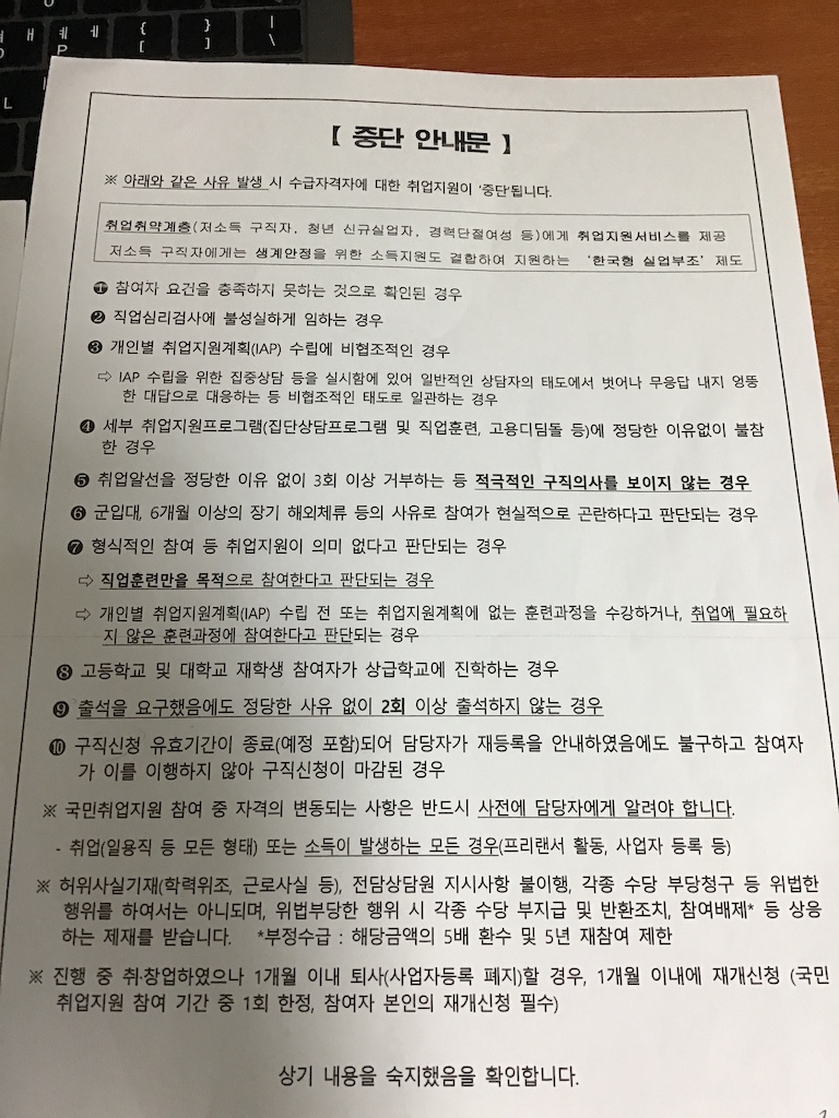 첫 번째 상담 시 주로 하는 것은 동의서와 확인서에 대한 서명이다. 아무래도 국가 예산으로 하는 제도이고 금액도 적지 않으니 성실하게 수행할 것을 약속하는 문서들과 불이행 시 받는 불이익에 대한 설명들이 주로 있다. 국민 취업지원제도는 단순히 일시적인 제도가 아닌 취업을 희망하는 사람들에게 환경을 조성하고 금전적인 지원까지 해주기 때문에 성실히 수행해야 한다.