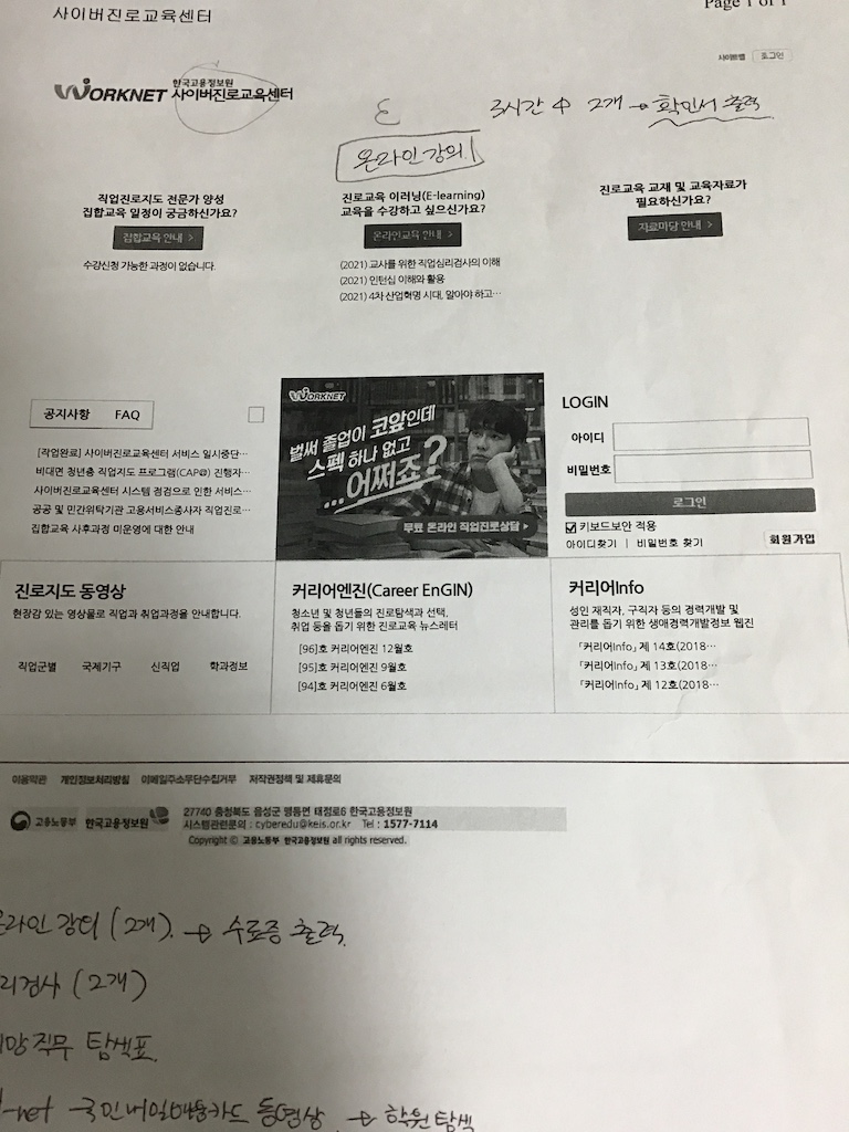 - 사이버진로교육센터에서 온라인 강의 2가지 수강 후 수료증 출력해서 제출