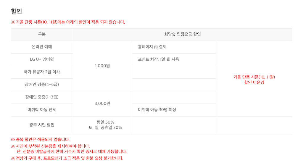 특히 광주 시민은 평일 50%, 주말 및 공휴일은 30% 할인이 되니 이 시기를 이용해서 광주 시민분들은 꼭 가보시는 것을 추천합니다.
